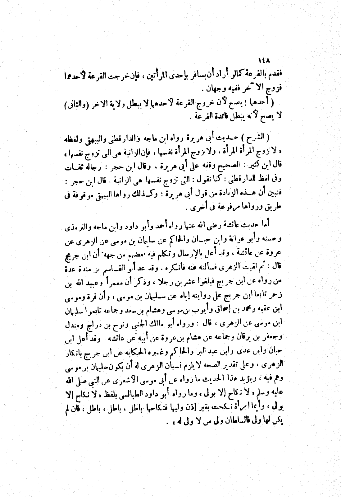 وقد عد أبو القاسم بن مندة عدة من رواه عن ابن جريج فبلغوا عشرين رجلا، وذكر أن معمرا وعبيد الله بن زحر تابعا ابن جريج على روايته إياه عن سليمان بن موسى، وأن قرة وموسى ابن عقبه ومحمد بن إسحاق وأيوب بن موسى وهشام بن سعد وجماعه تابعوا سليمان ابن موسى عن الزهري، قال: ورواه أبو مالك الجنبى ونوح بن دراج ومندل وجعفر بن برقان وجماعه عَنْ هِشَامِ بْنِ عُرْوَةَ عَنْ أَبِيهِ عَنْ عائشة وقد أعل ابن حبان وابن عدى وابن عبد البر والحاكم وغيره الحكايه عن ابن جريج بانكار الزهري، وعلى تقدير الصحه لا يلزم نسيان الزهري له أن يكون سليمان بن موسى وهم فيه، ويؤيد هذا الحديث ما رواه عن أَبِي مُوسَى الْأَشْعَرِيِّ عَنْ النَّبِيِّ صَلَّى اللَّهُ عليه وسلم (لانكاح إلا بولي) وما رواه أبو داود الطيالسي بلفظ (لا نكاح إلا بولي، وأيما امرأة نكحت بغير إذن وليها فنكاحها باطل، باطل، باطل، فان لم يكن لها ولى فالسلطان ولى من لا ولى له) .