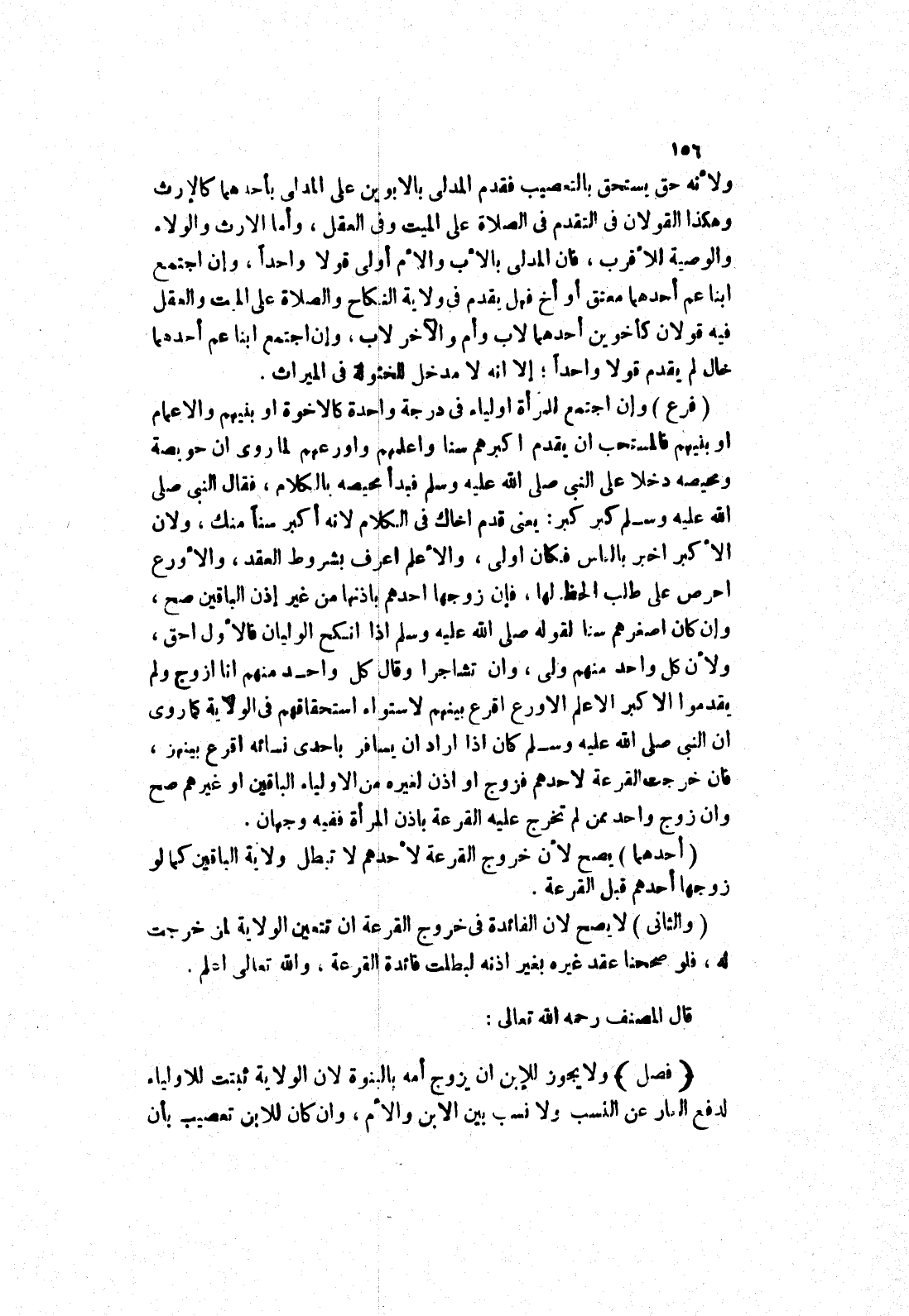 ولا يجوز للابن ان يزوج أمه بالبنوة لان الولاية ثبتت للاولياء لدفع العار عن النسب ولا نسب بين الابن والام، وان كان للابن تعصيب بأن