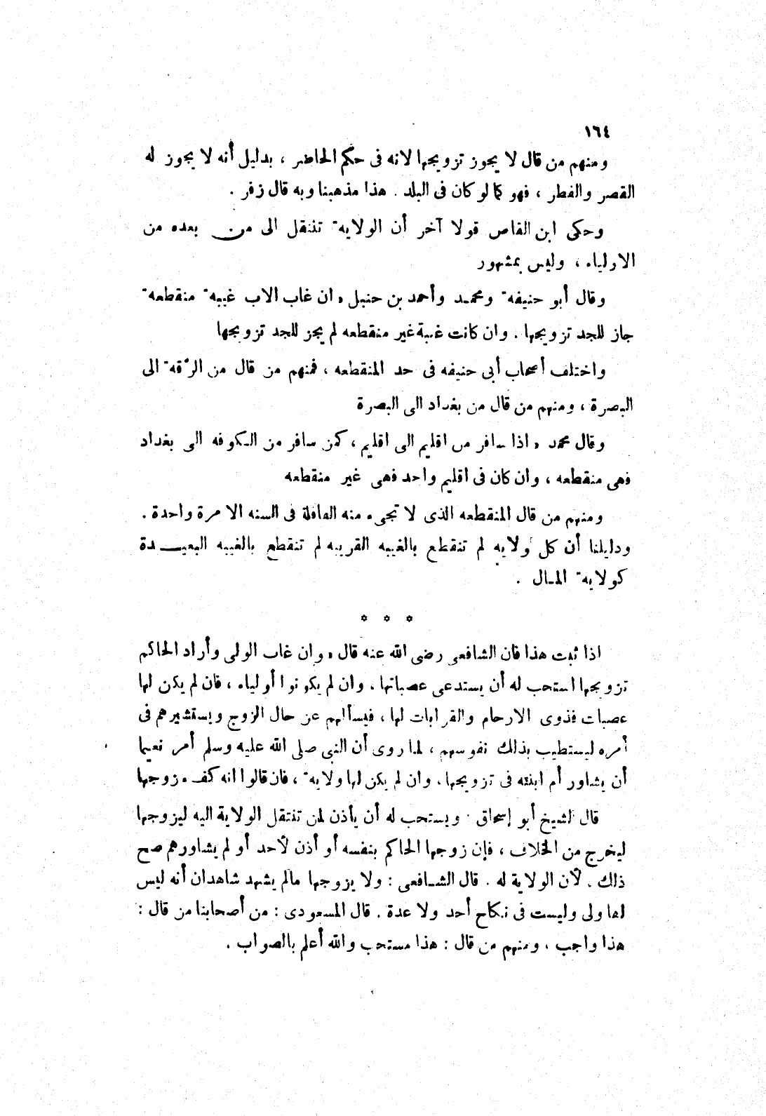 وحكى ابن القاص قولا آخر أن الولاية تنتقل إلى من بعده من الاولياء، وليس بمشهور وقال أبو حنيفة ومحمد وأحمد بن حنبل (أن غاب الاب غيبة منقطعة جاز للجد تزويجها.