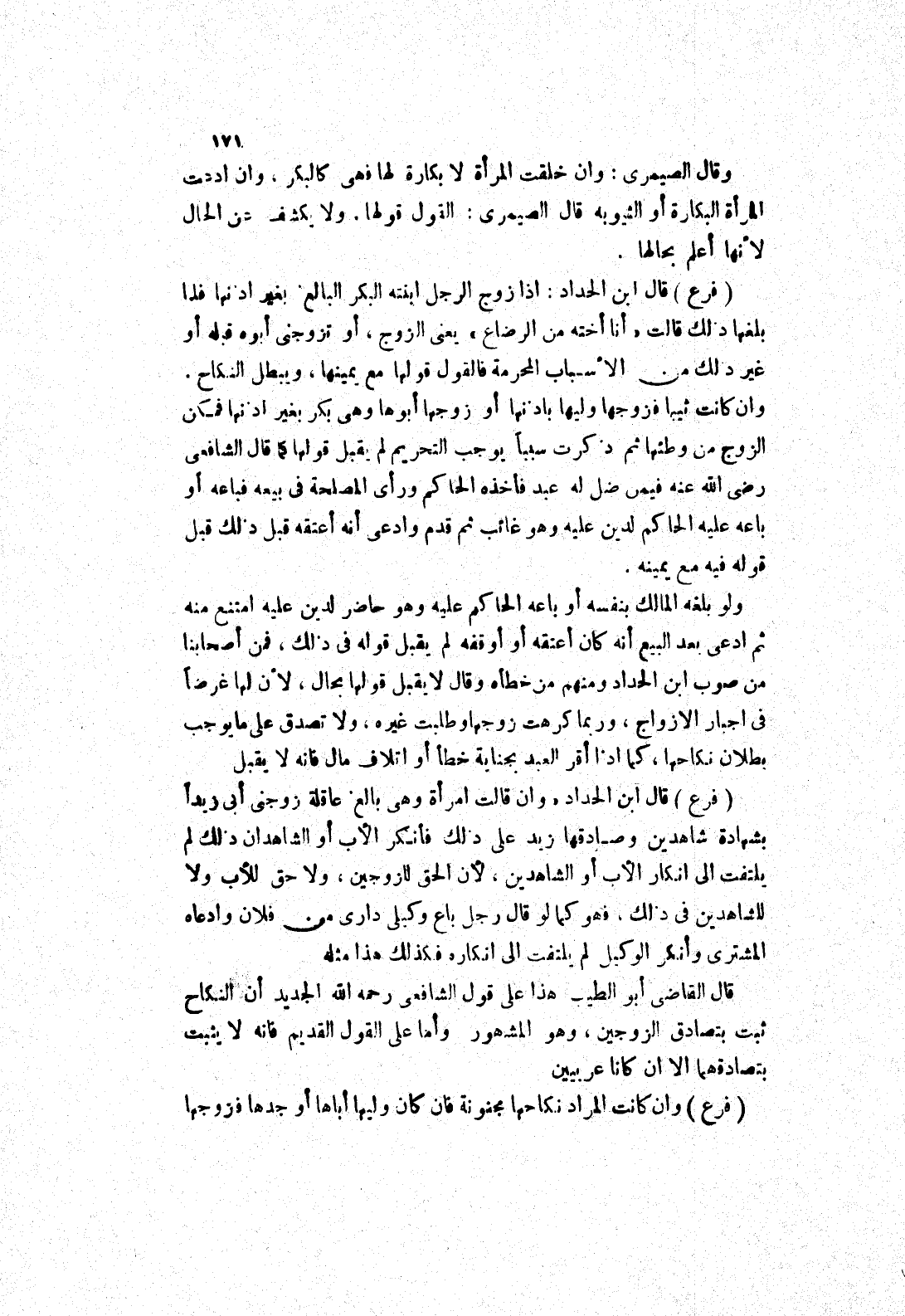 ولو بلغه المالك بنفسه أو باعه الحاكم عليه وهو حاضر لدين عليه امتنع منه ثم ادعى بعد البيع أنه كان أعتقه أو أوقفه لم يقبل قوله في ذلك، فمن أصحابنا من صوب ابن الحداد ومنهم من خطأه وقال لا يقبل قولها بحال، لان لها غرضا في اجبار الازواج، وربما كرهت زوجها وطلبت غيره، ولا تصدق على ما يوجب بطلان نكاحها، كما إذا أقر العبد بجناية خطأ أو اتلاف مال فانه لا يقبل (فرع)