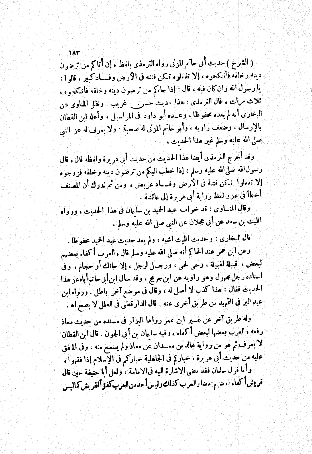 (الشرح) حديث أبى حاتم المزني رواه الترمذي بلفظ (إن أتاكم من ترضون دينه وخلقه فأنكحوه، إلا تفعلوه تكن فتنه في الارض وفساد كبير، قالوا: يا رسول الله وان كان فيه، قال: إذا جاءكم من ترضون دينه وخلقه فأنكحوه، ثلاث مرات) قال الترمذي: هذا حديث حسن غريب.