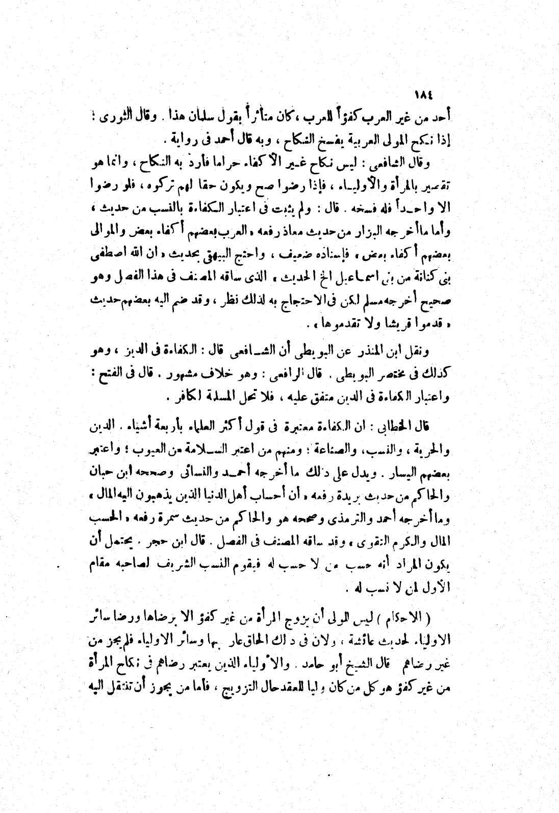 قال: ولم يثبت في اعتبار الكفاءة بالنسب من حديث، وأما ما أخرجه البزار من حديث معاذ رفعه (العرب بعضهم أكفاء بعض والموالي بعضهم أكفاء بعض) فإسناده ضعيف، واحتج البيهقى بحديث (ان الله اصطفى بنى كناية من بنى اسماعيل الخ الحديث) الذى ساقه المصنف في هذا الفصل وهو صحيح أخرجه مسلم لكن في الاحتجاج به لذلك نظر، وقد ضم إليه بعضهم حديث (قدموا قريشا ولا تقدموها) .