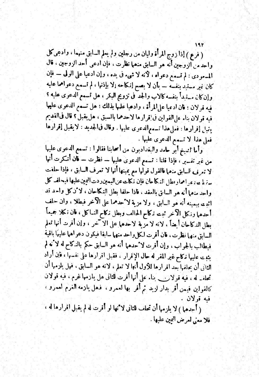 وأما الشيخ أبو حامد والبغداديون من أصحابنا فقالوا: تسمع الدعوى عليها من غير تفسير، فإذا قلنا: تسمع الدعوى عليها نظرت فان أنكرت أنها لا تعرف السابق منهما فالقول قولها مع يمينها أنها لا تعرف السابق، فإذا حلفت سقطت دعواهما وبطل النكاحان فإن نكلت عن اليمين ردت اليمين عليها فيحلف كل واحد منهما أنه هو السابق بالعقد، فإذا حلفا بطل النكاحان، لان كل واحد قد اثبت بيمينه أنه هو السابق، ولا مزية لاحدهما على الآخر فبطلا، وان حلف أحدهما ونكل الآخر ثبت نكاح الحالف وبطل نكاح الناكل، فان نكلا جميعا بطل النكاحان أيضا، لانه لا مزية لاحدهما على الآخر، وإن أقرت أنها تعلم السابق منهما نظرت، فان أقرت لكل واحد منهما سابقا فيكون دعواهما عليها باقية فيطالب بالجواب، وإن أقرت لاحدهما أنه هو السابق حكم بالنكاح له لانه لم يثبت عليها نكاح غير المقر له حال الاقرار، فقبل اقرارها على نفهسا، فان أراد الثاني أن يحلفها بعد اقرارها للاول أنها لا تعلم، لانه هو السابق، فهل يلزمها أن تحلف له، فيه قولان بناء على أنها أقرت للثاني هل يلزمها غرم، فيه قولان كالقولين فيمن أقر بدار لزيد ثم أقر بها لعمرو، فهل يلزمه الغرم لعمرو، فيه قولان.