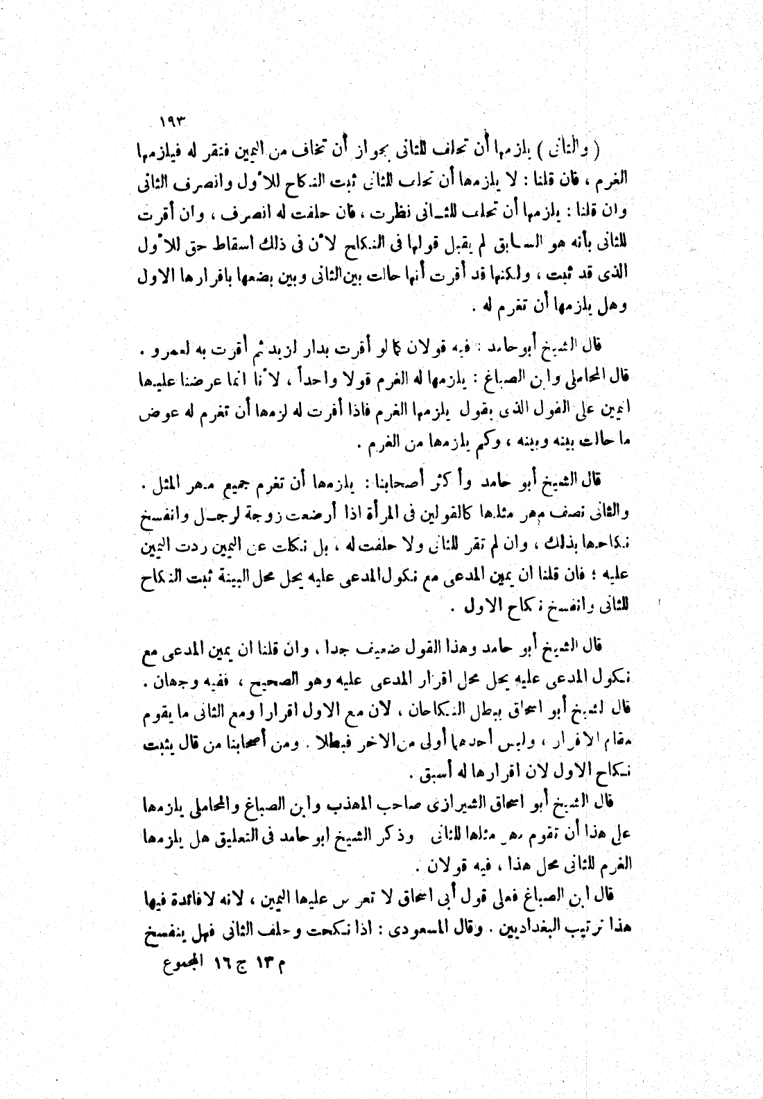 قال الشيخ أبو حامد وهذا القول ضعيف جدا، وان قلنا ان يمين المدعى مع نكول المدعى عليه يحل محل اقرار المدعى عليه وهو الصحيح، ففيه وجهان.