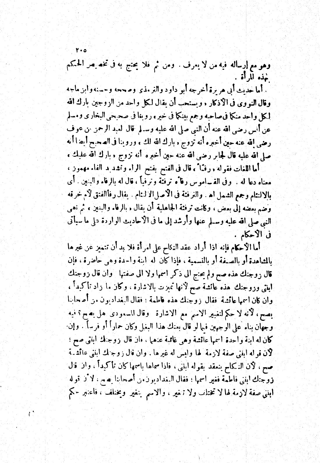 ومن ثم فلا يحتج به في تخصيص الحكم بهذه المرأة أما حديث أبى هريرة أخرجه أبو داود والترمذي وصححه وحسنه وابن ماجه وقال النووي في الاذكار (ويستحب أن يقال لكل واحد من الزوجين بارك الله لكل واحد منكما في صاحبه وجمع بينكما في خير) روينا في صحيحي البخاري ومسلم عَنْ أَنَسٌ رَضِيَ اللَّهُ عَنْهُ أَنَّ النَّبِيَّ صَلَّى اللَّهُ عليه وسلم قال لعبد الرحمن بن عوف رضى الله عنه حين أخبره أنه تزوج (بارك الله لك) وروينا في الصحيح أيضا أنه صلى الله عليه لجابر رضى الله عنه حين أخبره أنه تزوج (بارك الله عليك) أما اللغات فقوله (رفأ) قال في الفتح بفتح الراء وتشديد الفاء مهموز، معناه دعا له.