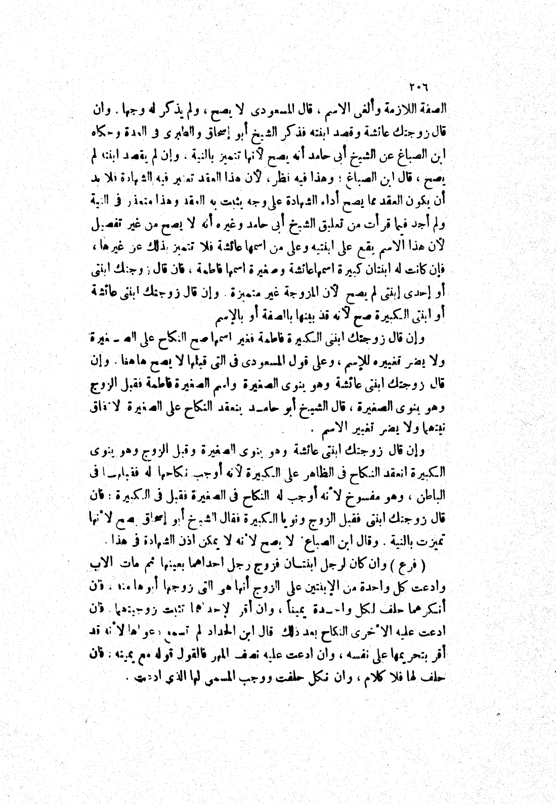وان قال زوجتك عائشة وقصد ابنته فذكر الشيخ أبو إسحاق والطبري في العدة وحكاه ابن الصباغ عن الشيخ أبى حامد أنه يصح لانها تتميز بالنية، وإن لم يقصد ابنته لم يصح، قال ابن الصباغ، وهذا فيه نظر، لان هذا العقد تعتبر فيه الشهادة فلا بد أن يكون العقد مما يصح أداء الشهادة على وجه يثبت به العقد وهذا متعذر في النية ولم أجد فيما قرأت من تعليق الشيخ أبى حامد وغيره أنه لا يصح من غير تفصيل لان هذا الاسم يقع على ابنتيه وعلى من اسمها عائشة فلا تتميز بذلك عن غيرها، فإن كانت له ابنتان كبيرة اسمها عائشة وصغيرة اسمها فاطمة، فان قال زوجتك ابنتى أو إحدى إبنتى لم يصح لان المزوجة غير متميزة.