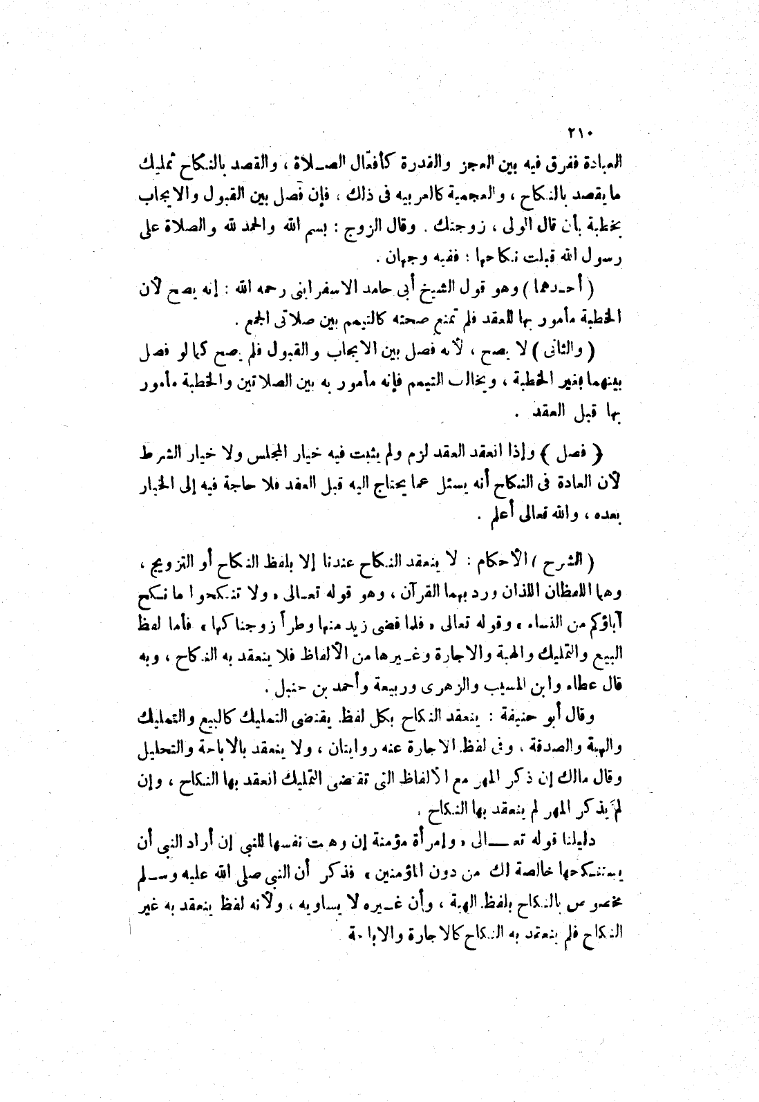 (الشرح) الاحكام: لا ينعقد النكاح عندنا إلا بلفظ النكاح أو التزويج، وهما اللفظان اللذان ورد بهما القرآن، وهو قوله تعالى (ولا تنكحوا ما نكح آباؤكم من النساء) وقوله تعالى (فلما قضى زيد منها وطرا زوجناكها) فأما لفظ البيع والتمليك والهبة والاجارة وغيرها من الالفاظ فلا ينعقد به النكاح، وبه قال عطاء وابن المسيب والزهرى وربيعة وأحمد بن حنبل.