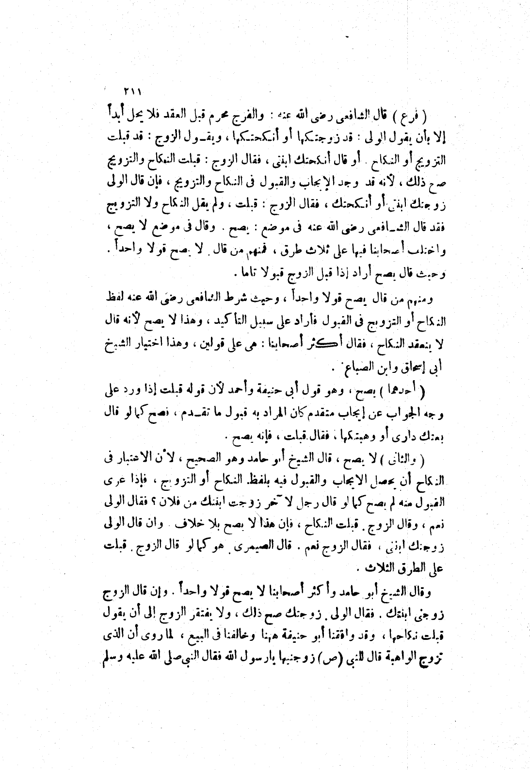 قال الشافعي رضى الله عنه: والفرج محرم قبل العقد فلا يحل أبدا إلا بأن يقول الولى: قد زوجتكها أو أنكحتكها، ويقول الزوج: قد قبلت التزويج أو النكاح.