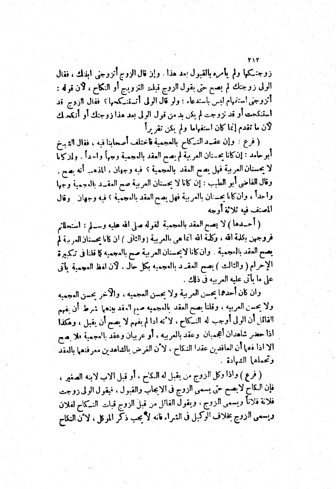 وان كان أحدهما يحسن العربية ولا يحسن العجمية، والآخر يحسن العجمية ولا يحسن العربية، وقلنا يصح العقد بالعجمية صح العقد بينهما شرط أن يفهم القائل أن الولى أوجب له النكاح، لانه إذا لم يفهم لا يصح أن يقبل، وهكذا إذا حضر شاهدان أعجميان وعقد بالعربية، أو عربيان وعقد بالعجمية فلا يصح الا إذا فهما أن العاقدين عقد النكاح، لان الغرض بالشاهدين معرفتهما بالعقد وتحملهما الشهادة.