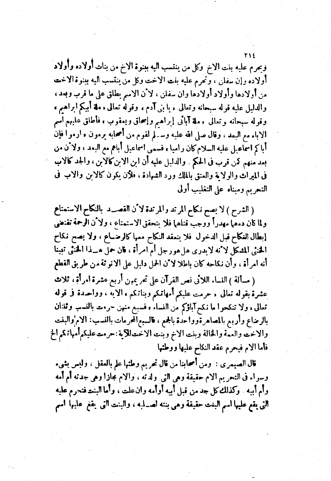 وقوله سبحانه وتعالى (ملة آبائى إبراهيم وإسحاق ويعقوب) فأطلق عليهم اسم الاباء مع البعد، وقال صلى الله عليه وسلم لقوم من أصحابه يرمون (ارموا فإن أباكم اسماعيل عليه السلام كان راميا) فسمى اسماعيل أباهم مع البعد، ولان من بعد منهم كمن قرب في الحكم، والدليل عليه أن ابن الابن كالابن، والجد كالاب في الميراث والولاية والعتق بالملك ورد الشهادة، فلان يكون كالابن والاب في التحريم ومبناه على التغليب أولى (الشرح) لا يصح نكاح المرتد والمرتدة لان القصد بالنكاح الاستمتاع ولما كان دمهما مهدرا ووجب قتلهما فلا يتحقق الاستمتاع، ولان الرحمة تقتضي إبطال النكاح قبل الدخول فلا ينعقد النكاح معها كالرضاع، ولا يصح نكاح الخنثى المشكل لانه لا يدرى هل هو رجل أم امرأة، فان حمل هذا الخنثى تبينا أنه امرأة، وأن نكاحه كان باطلا لان الحمل دليل على الانوثة من طريق القطع (مسألة) النساء اللائى نص القرآن على تحريمهن أربع عشرة امرأة، ثلاث عشرة بقوله تعالى (حرمت عليكم أمهاتكم وبناتكم) الايه، وواحدة في قوله تعالى (ولا تنكحوا ما نكح آباؤكم من النساء) فسبع منهن حرمت بالنسب وثنتان بالرضاع وأربع بالمصاهرة وواحدة بالجمع، فالسبع المحرمات بالنسب: الام والبنت والاخت والعمة والخالة وبنت الاخ وبنت الاخت للآية: حرمت عليكم أمهاتكم الخ فأما الام فيحرم عقد النكاح عليها ووطئها.