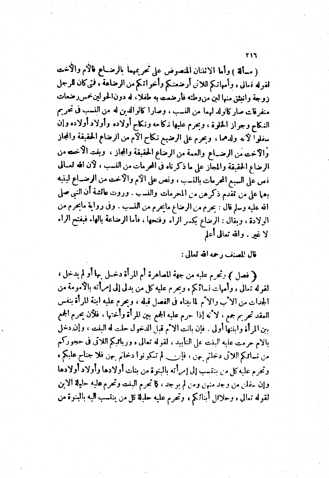 وتحرم عليه من جهة المصاهرة أم المرأة دخل بها أو لم يدخل، لقوله تعالى ((وأمهات نسائكم) ويحرم عليه كل من يدلى إلى إمرأته بالامومة من الجدات من الاب والام لما بيناه في الفصل قبله، ويحرم عليه ابنة المرأة بنفس العقد تحريم جمع، لانه إذا حرم عليه الجمع بين المرأة وأختها، فلان يحرم الجمع بين المرأة وابنتها أولى.