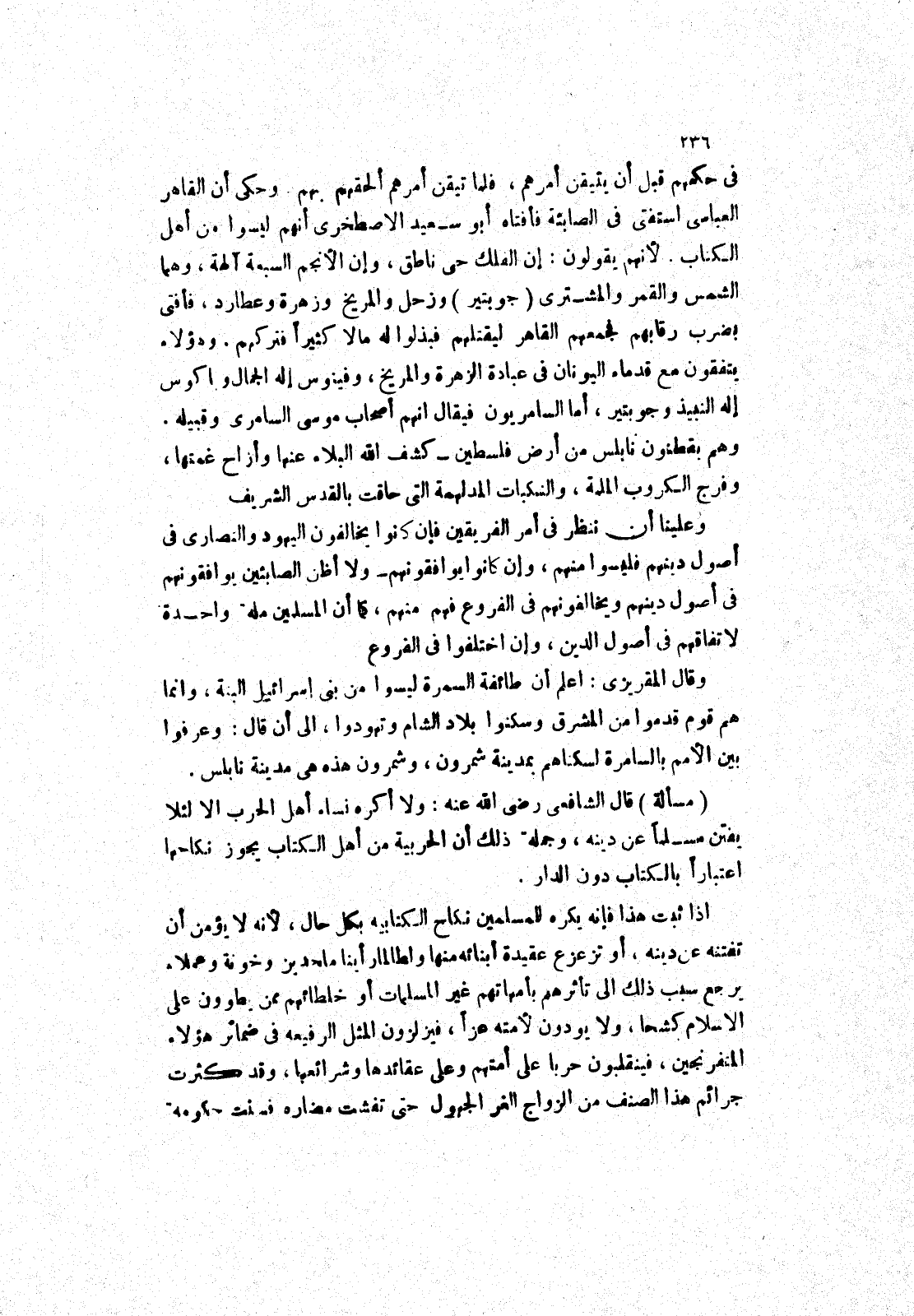 وعلينا أن تنظر في أمر الفريقين فإن كانوا يخالفون اليهود والنصارى في أصول دينهم فليسوا منهم، وإن كانوا يوافقونهم ولا أظن الصابئين يوافقونهم في أصول دينهم ويخالفونهم في الفروع فهم منهم، كما أن المسلمين ملة واحدة لاتفاقهم في أصول الدين، وإن اختلفوا في الفروع.