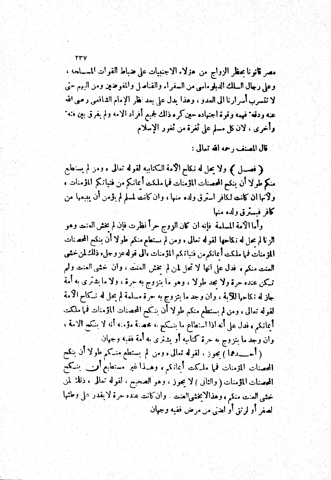 مصر قانونا بحظر الزواج من هؤلاء الاجنبيات على ضباط القوات المسلحه، وعلى رجال السلك الدبلوماسي من السفراء والقناصل والمفوضين ومن إليهم حتى لا تتسرب أسرارنا إلى العدو، وهذا يدل على بعد نظر الامام الشافعي رضى الله عنه ودقة فهمه وقوة اجتهاده حين كره ذلك لجميع أفراد الامه ولم يفرق بين فئه