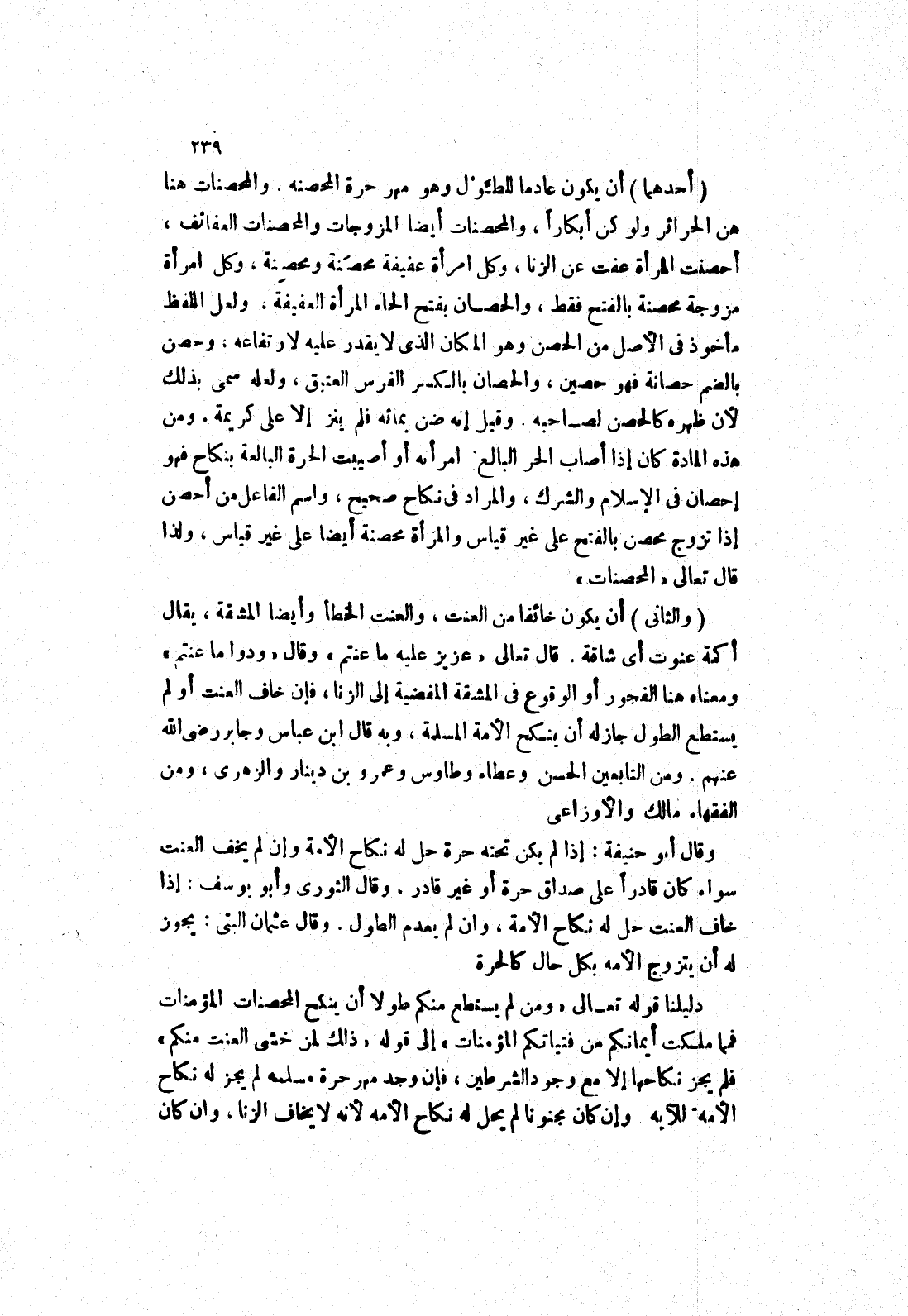 ومن هذه المادة كان إذا أصاب الحر البالغ امرأته أو أصيبت الحرة البالغة بنكاح فهو إحصان في الاسلام والشرك، والمراد في نكاح صحيح، واسم الفاعل من أحصن إذا تزوج محصن بالفتح على غير قياس والمرأة محصنة أيضا على غير قياس، ولذا قال تعالى (المحصنات) .