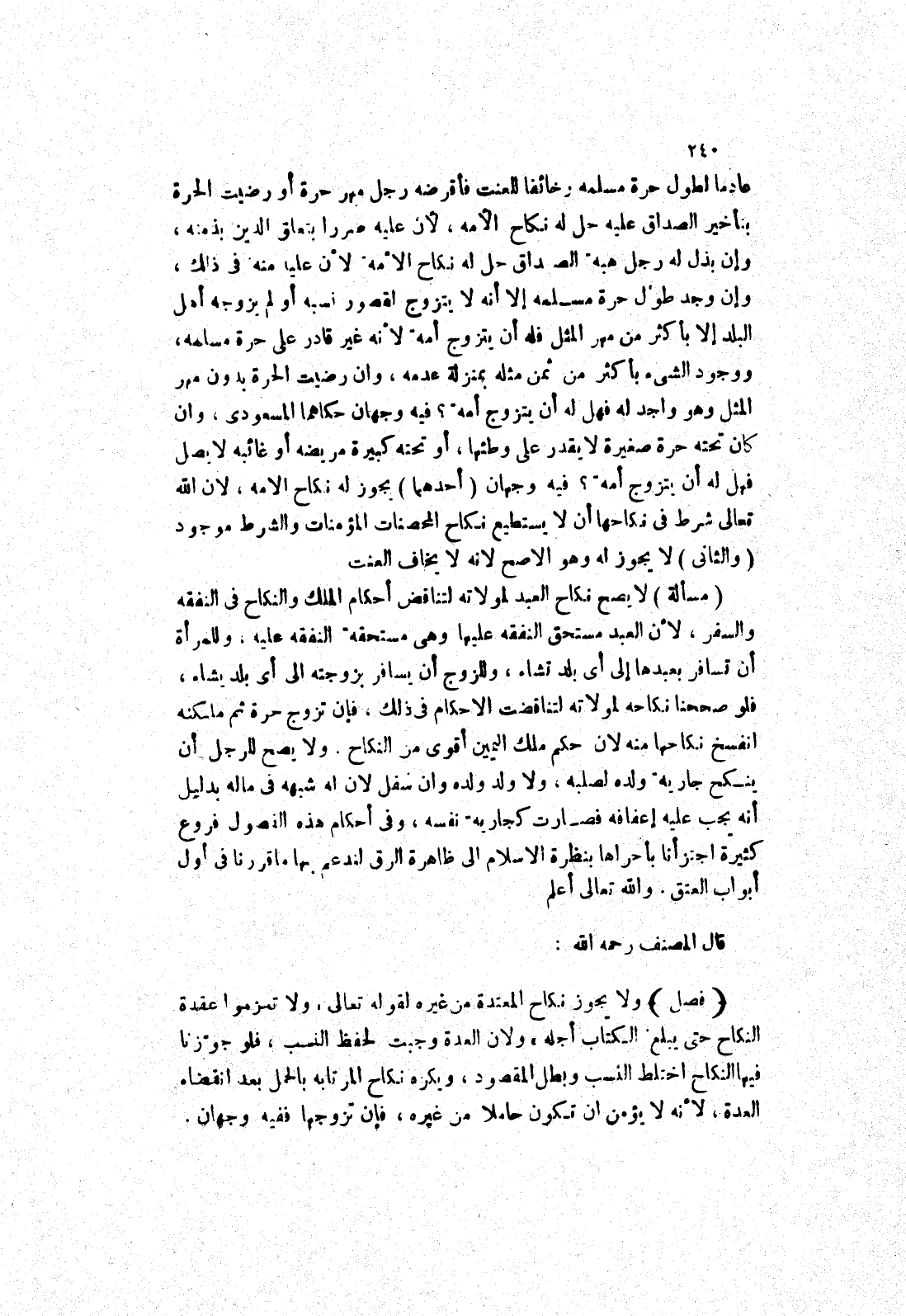 ولا يصح للرجل أن ينكح جارية ولده لصلبه، ولا ولد ولده وان سفل لان له شبهه في ماله بدليل أنه يجب عليه إعفافه فصارت كجارية نفسه، وفى أحكام هذه الفصول فروع كثيرة اجتزأنا بأحراها بنظرة الاسلام إلى ظاهرة الرق لندعم بها ما قررنا في أول أبواب العتق.