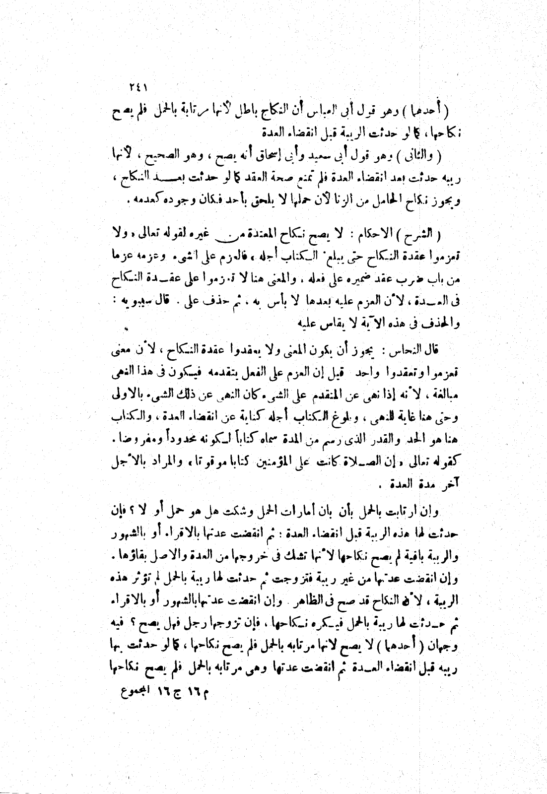كقوله تعالى (إن الصلاة كانت على المؤمنين كتابا موقوتا) والمراد بالاجل آخر مدة العدة، وإن ارتابت بالحمل بأن أمارات الحمل وشكت هل هو حمل أو لا؟ فإن حدثت لها هذه الريبة قبل انقضاء العدة: ثم انقضت عدتها بالاقراء أو بالشهور والريبة باقية لم يصح نكاحها لانها تشك في خروجها من العدة والاصل بقاؤها.