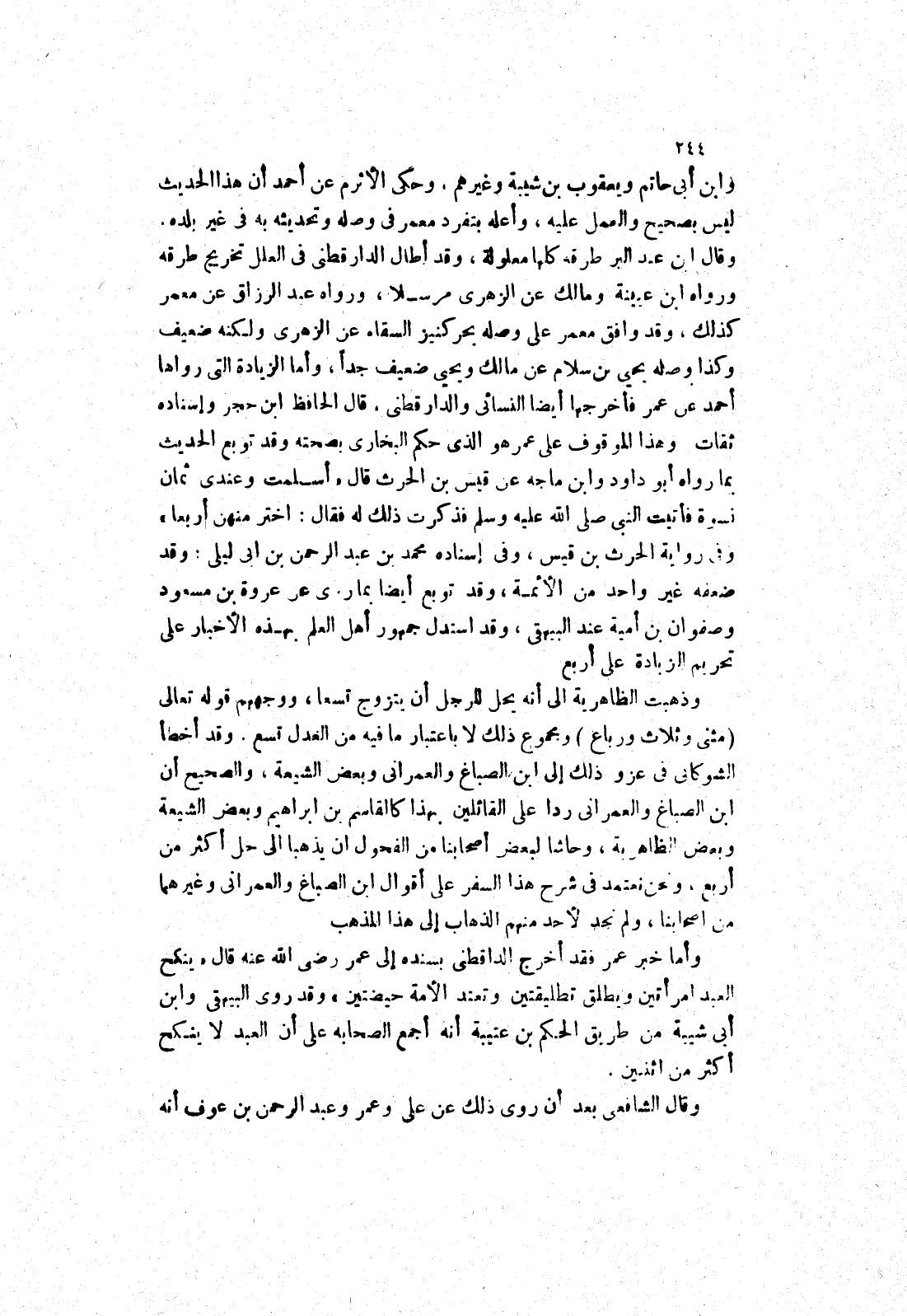 وقد أخطأ الشوكاني في عزو ذلك إلى ابن الصباغ والعمراني وبعض الشيعة، والصحيح أن ابن الصباغ والعمراني ردا على القائلين بهذا كالقاسم بن ابراهيم وبعض الشيعة وبعض الظاهرية، وحاشا لبعض أصحابنا من الفحول ان يذهبا إلى حل أكثر من أربع، ونحن نعتمد في شرح هذا السفر على أقوال ابن الصباغ والعمراني وغيرهما من أصحابنا، ولم نجد لاحد منهم الذهاب إلى هذا المذهب.