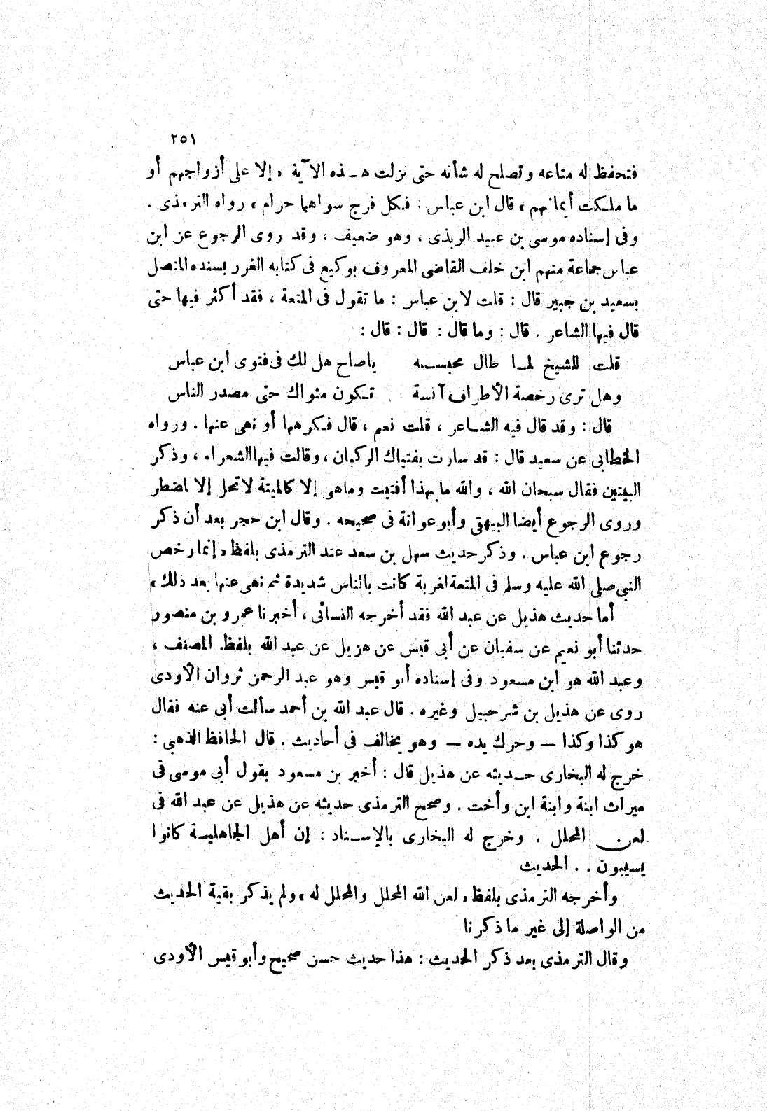 وفى إسناده موسى بن عبيد الربذى، وهو ضعيف، وقد روى الرجوع عن ابن عباس جماعة منهم ابن خلف القاضى المعروف بوكيع في كتابه الغرر بسنده المتصل بسعيد بن جبير قال: قلت لابن عباس: ما تقول في المتعة، فقد أكثر فيها حتى قال فيها الشاعر.