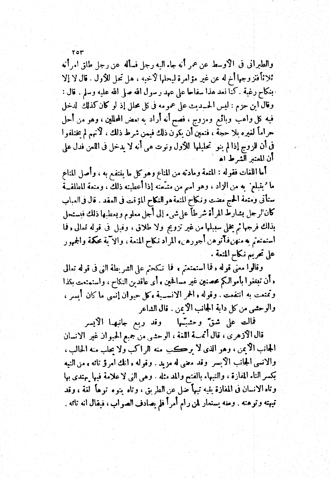 حراما لغيره بلا حجة، فتعين أن يكون ذلك فيمن شرط ذلك، لانهم لم يختلفوا في أن للزوج إذا لم ينو تحليلها للاول ونوت هي أنه لا يدخل في اللعن فدل على أن المعتبر الشرط اه أما اللغات فقوله: المتعة ومادته من المتاع وهو كل ما ينتفع به، وأصل المتاع ما يتبلغ به من الزاد، وهو اسم من متعته إذا أعطيته ذلك، ومتعة المطلقة ستأتي ومتعة الحج مضت ونكاح المتعة هو النكاح المؤقت في العقد.