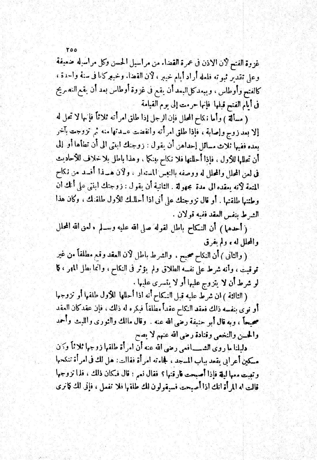 غزوة الفتح لان الاذن في عمرة القضاء من مراسيل الحسن وكل مراسيله ضعيفة وعلى تقدير ثبوته فلعله أراد أيام خيبر، لان القضاء وخيبر كانا في سنة واحدة، كالفتح وأوطاس، ويبعد كل البعد أن يقع في غزوة أوطاس بعد أن يقع التصريح في أيام الفتح قبلها فإنها حرمت إلى يوم القيامة (مسألة) وأما نكاح المحلل فإن الرجل إذا طلق امرأته ثلاثا فإنها لا تحل له إلا بعد زوج وإصابة، فإذا طلق امرأته وانقضت عدتها منه ثم تزوجت بآخر بعده ففيها ثلاث مسائل إحداهن أن يقول: زوجتك ابنتى إلى أن تطأها أو إلى أن تحللها للاول، فإذا أحللتها فلا نكاح بينكما، وهذا باطل بلا خلاف للاحاديث في لعن المحلل والمحلل له ووصفه بالتيس المستعار، ولان هذا أفسد من نكاح المتعة لانه يعقده إلى مدة مجهولة.