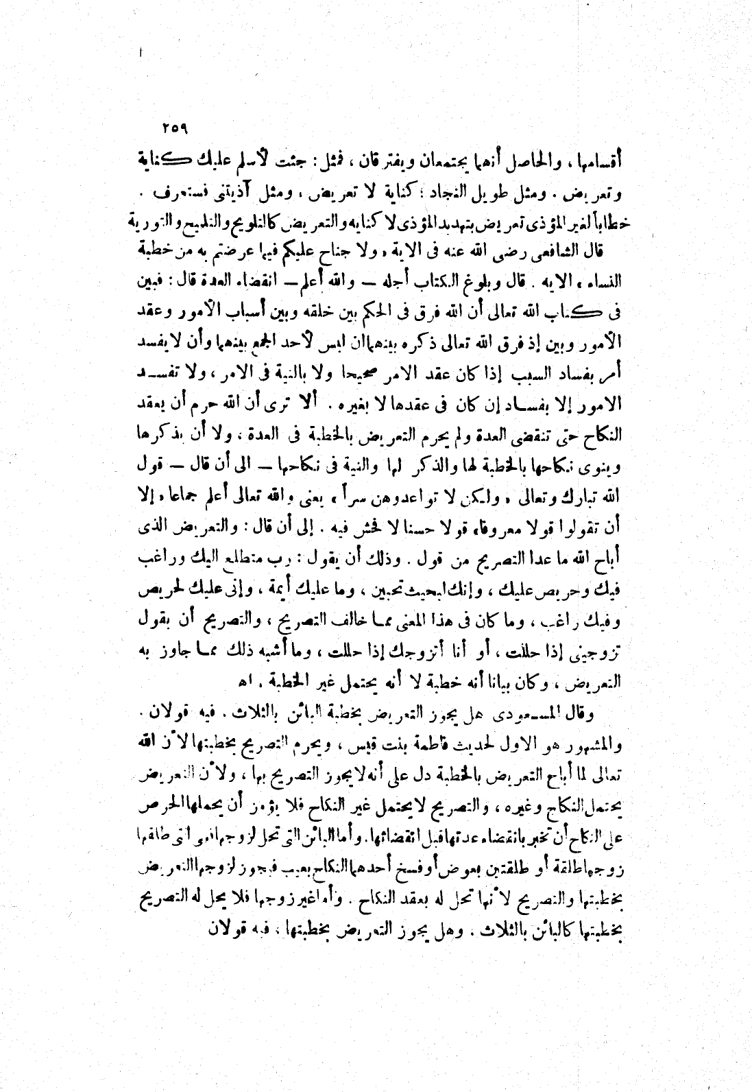 خطابا لغير المؤذى تعريض بتهديد المؤذى لا كنايه والتعريض كالتلويح والتلميح والتورية قال الشافعي رضى الله عنه في الاية (وَلا جُنَاحَ عَلَيْكُمْ فِيمَا عَرَّضْتُمْ بِهِ مِنْ خطبة النساء) الايه، قال وبلوغ الكتاب أجله والله أعلم انقضاء العدة قال: فبين في كتاب الله تعالى أن الله فرق في الحكم بين خلقه وبين أسباب الامور وعقد الامور وبين إذ فرق الله تعالى ذكره بينهما ان ليس لاحد الجمع بينهما وأن لا يفسد أمر بفساد السبب إذا كان عقد الامر صحيحا ولا بالنية في الامر، ولا تفسد الامور إلا بفساد إن كان في عقدها لا بغيره.