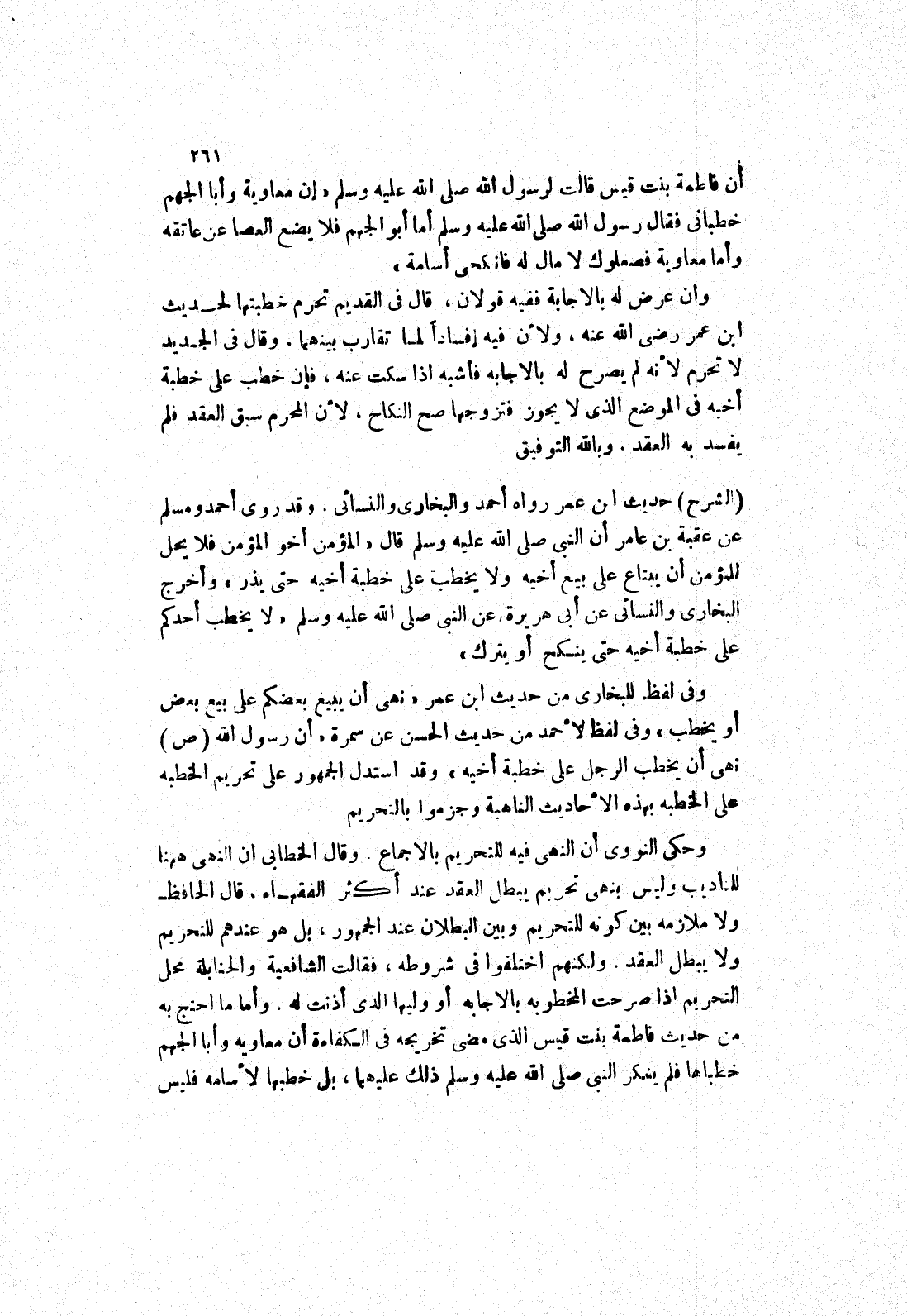 وأما ما احتج به من حديث فاطمة بنت قيس الذى مضى تخريجه في الكفاءة أن معاوية وأبا الجهم خطباها فلم ينكر النبي صلى الله عليه وسلم ذلك عليهما، بل خطبها لاسامه فليس