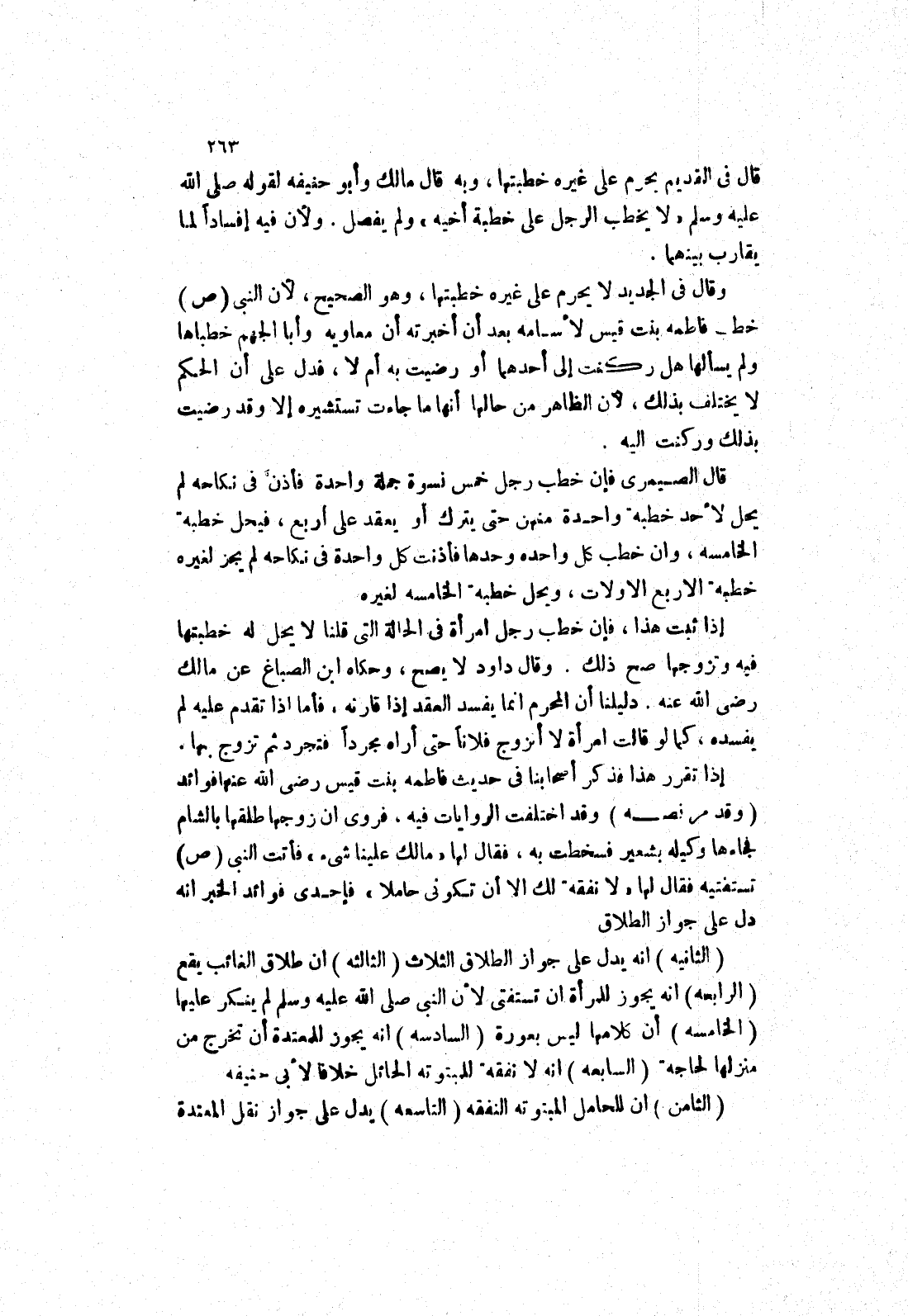 إذا تقرر هذا فذكر أصحابنا في حديث فاطمة بنت قيس رضى الله عنها فوائد (وقد مر نصه) وقد اختلفت الروايات فيه، فروى ان زوجها طلقها بالشام فجاءها وكيله بشعير فسخطت به، فقا لها (مالك علينا شئ) فأتت النبي صلى الله عليه وسلم تستفتيه فقال لها (لا نفقة لك الا أن تكوني حاملا) فإحدى فوائد الخبر انه دل على جواز الطلاق.