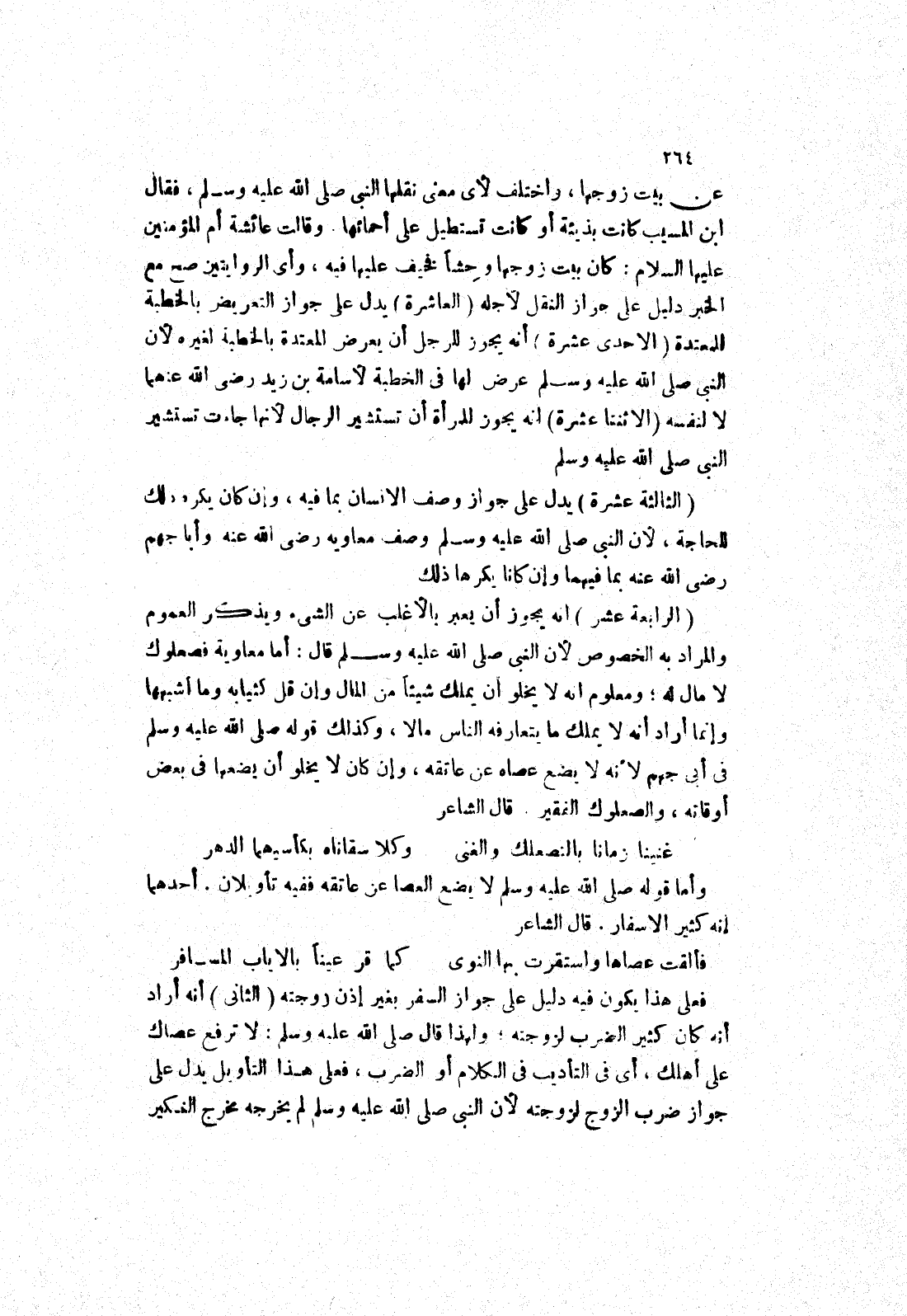 وقالت عائشة أم المؤمنين عليها السلام: كان بيت زوجها وحشا فخيف عليها فيه، وأى الروايتين صح مع الخبر دليل على جواز النقل لاجله (العاشرة) يدل على جواز التعريض بالخطبة للمعتدة (الاحدى عشرة) أنه يجوز للرجل أن يعرض المعتدة بالخطبة لغيره لان النبي صلى الله عليه وسلم عرض لها في الخطبة لاسامة بن زيد رضى الله عنهما لا لنفسه (الاثنتا عشرة) انه يجوز للمرأة أن تستشير الرجال لانها جاءت تستشير النبي صلى الله عليه وسلم (الثالثة عشرة) يدل على جواز وصف الانسان بما فيه، وإن كان يكره ذلك للحاجة، لان النبي صلى الله عليه وسلم وصف معاويه رضى الله عنه وأبا جهم رضى الله عنه بما فيهما وإن كانا يكرها ذلك (الرابعة عشر) انه يجوز أن يعبر بالاغلب عن الشئ ويذكر العموم والمراد به الخصوص لِأَنَّ النَّبِيَّ صَلَّى اللَّهُ عَلَيْهِ وَسَلَّمَ قَالَ: أما معاوية فصعلوك لا مال له، ومعلوم انه لا يخلو أن يملك شيئا من المال وإن قل كثيابه وما أشبهها وإنما أراد أنه لا يملك ما يتعارفه الناس مالا، وكذلك قوله صلى الله عليه وسلم في أبى جهم لانه لا يضع عصاه عن عاتقه، وإن كان لا يخلو أن يضعها في بعض أوقاته، والصعلوك الفقير.