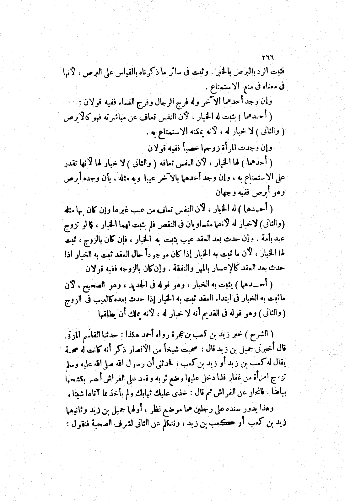 (الشرح) خبر زيد بن كعب بن عجرة رواه أحمد هكذا: حدثنا القاسم المزني قال أخبرني جميل بن زيد قال: صحبت شيخا من الانصار ذكر أنه كانت له صحبة يقال له كعب بن زيد أو زيد بن كعب، فحدثني أَنَّ رَسُولَ اللَّهِ صَلَّى اللَّهُ عَلَيْهِ وَسَلَّمَ تزوج امرأة من غفار فلما دخل عليها وضع ثوبه وقعد على الفراش أبصر بكشحها بياضا، فانحاز عن الفراش ثم قال: خذى عليك ثيابك ولم يأخذ مما آتاها شيئا (وهذا يدور سنده على رجلين هما موضع نظر، أولهما جميل بن زيد وثانيهما زيد بن كعب أو كعب بن زيد، ونتكلم عن الثاني لشرف الصحبة فنقول: