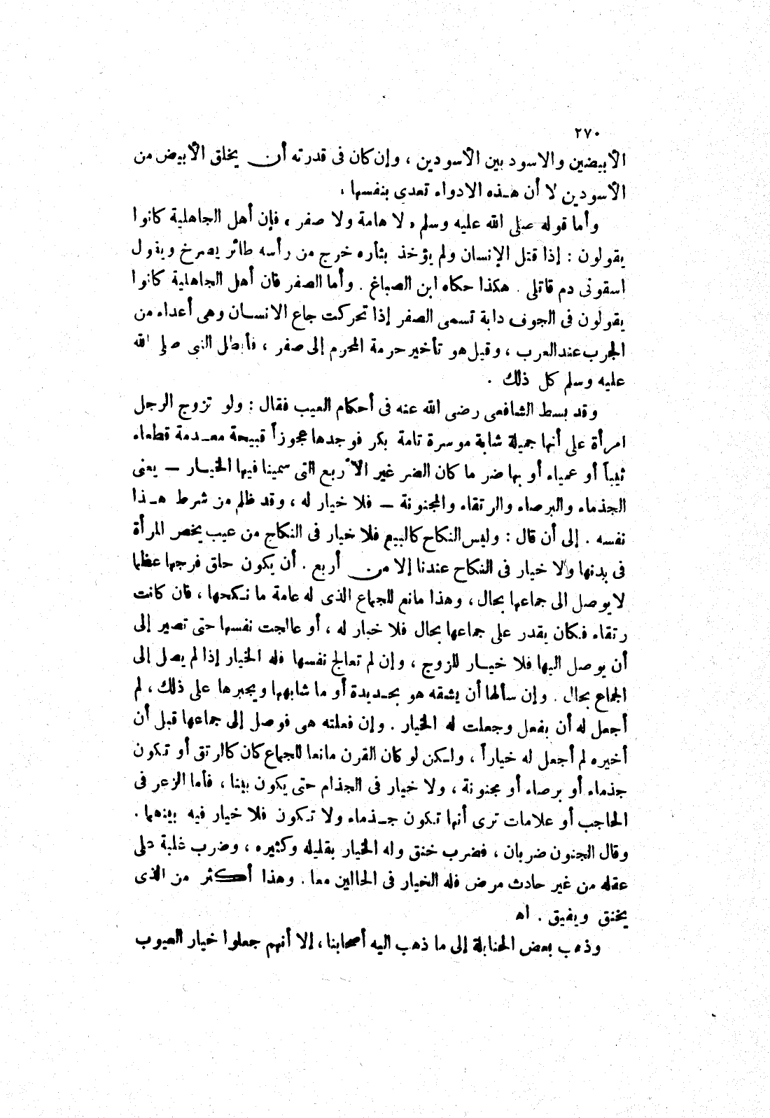 وقد بسط الشافعي رضى الله عنه في أحكام العيب فقال: ولو تزوج الرجل امرأة على أنها جميلة شابة موسرة تامة بكر فوجدها عجوزا قبيحة معدمة قطعاء ثيبا أو عمياء أو بها ضر ما كان الضر غير الاربع التى سمينا فيها الخيار يعنى الجذماء والبرصاء والرتقاء والمجنونة فلا خيار له، وقد ظلم من شرط هذا نفسه.