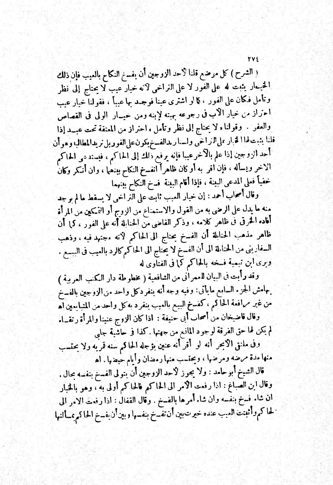 وقد رأيت في البيان للعمراني من الشافعية (مخطوطة دار الكتب العربية) بهامش الجزء السابع ما يأتي: وفيه وجه أنه ينفرد كل واحد من الزوجين بالفسخ من غير مرافعة الحاكم، كفسخ البيع بالعيب ينفرد به كل واحد من المتبايعين اه وقال قاضيخان من أصحاب أبى حنيفة: إذا كان الزوج عنينا والمرأة رتقاء لم يكن لها حق الفرقة لوجود المانع من جهتها.