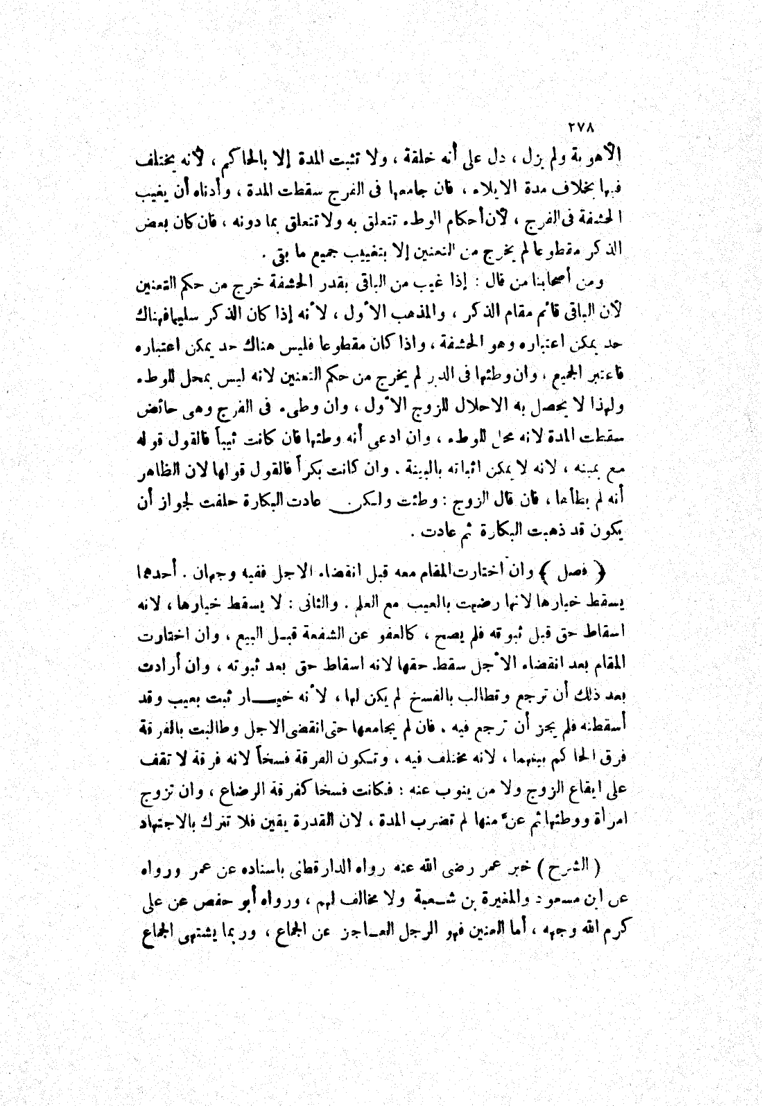 والثانى: لا يسقط خيارها، لانه اسقاط حق قبل ثبوته فلم يصح، كالعفو عن الشفعة قبل البيع، وان اختارت المقام بعد انقضاء الاجل سقط حقها لانه اسقاط حق بعد ثبوته، وان أرادت بعد ذلك أن ترجع وتطالب بالفسخ لم يكن لها، لانه خيار ثبت بعيب وقد أسقطنه فلم يجز أن ترجع فيه، فان لم يجامعها حتى انقضى الاجل وطالبت بالفرقة فرق الحاكم بينهما، لانه مختلف فيه، وتكون الفرقة فسخا لانه فرقة لا تقف على ايقاع الزوج ولا من ينوب عنه: فكانت فسخا كفرقة الرضاع، وان تزوج امرأة ووطئها ثم عن منها لم تضرب المدة، لان القدرة يقين فلا تترك بالاجتهاد (الشرح) خبر عمر رضى الله عنه رواه الدارقطني باسناده عن عمر ورواه عن ابن مسعود والمغيرة بن شعبة ولا مخالف لهم، ورواه أبو حفص عن علي كرم الله وجهه، أما العنين فهو الرجل العاجز عن الجماع، وربما يشتهى الجماع