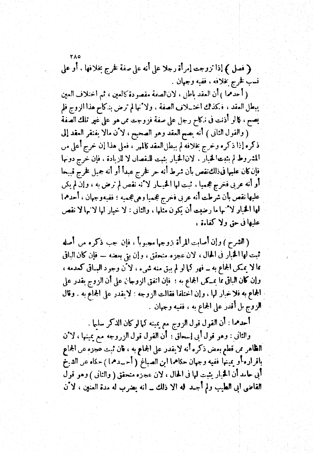 أن العقد باطل، لان الصفة مقصودة كالعين، ثم اختلاف العين يبطل العقد، فكذلك اختلاف الصفة، ولانها لم ترض بنكاح هذا الزوج فلم يصح، كما لو أذنت في نكاح رجل على صفة فزوجت ممن هو على غير تلك الصفة (والقول الثاني) أنه يصح العقد وهو الصحيح، لان ما لا يفتقر العقد إلى ذكره إذا ذكره وخرج بخلافه لم يبطل العقد كالمهر، فعلى هذا إن خرج أعلى من المشروط لم يثبت الخيار، لان الخيار يثبت للنقصان لا للزيادة، فإن خرج دونها فإن كان عليها في ذلك نقص بأن شرط أنه حر فخرج عبدا أو أنه جميل فخرج قبيحا أو أنه عربي فخرج عجميا، ثبت لها الخيار لانه نقص لم ترض به، وإن لم يكن عليها نقص بأن شرطت أنه عربي فخرج عجميا وهى عجميه، ففيه وجهان، أحدهما لها الخيار لانها ما رضيت أن يكون مثلها، والثانى: لا خيار لها لانها لا نقص عليها في حق ولا كفاءة: (الشرح) وإن أصابت المرأة زوجها مجبوبا، فإن جب ذكره من أصله ثبت لها الخيار في الحال، لان عجزه متحقق، وإن بقى بعضه فإن كان الباقي مما لا يمكن الجماع به فهو كما لو لم يبق منه شئ، لان وجود الباقي كعدمه، وإن كان الباقي مما يمكن الجماع به، فإن اتفق الزوجان على أن الزوج يقدر على الجماع به فلا خيار لها، وإن اختلفا فقالت الزوجه، لا يقدر على الجماع به، وقال الزوج بل أقدر على الجماع به، ففيه وجهان.