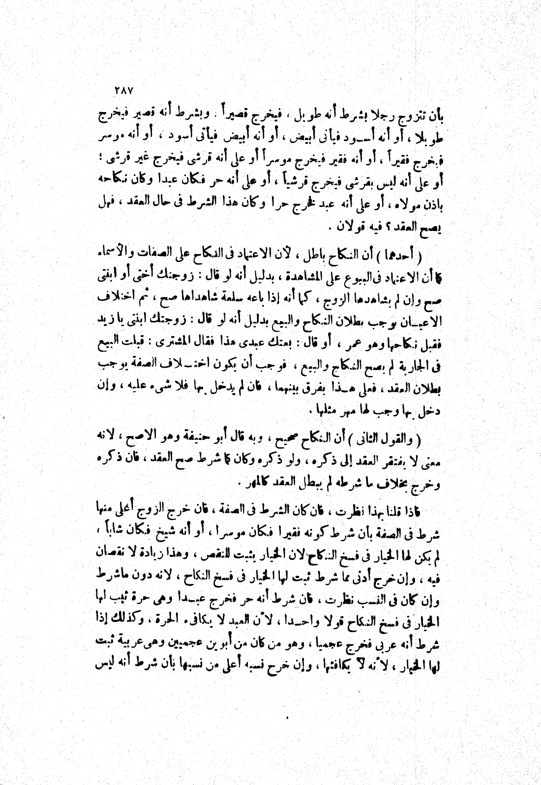 بأن تتزوج رجلا بشرط أنه طويل، فيخرج قصيرا: وبشرط أنه قصير فيخرج طويلا، أو أنه أسود فيأتى أبيض، أو أنه أبيض فيأتى أسود، أو أنه موسر فيخرج فقيرا، أو أنه فقير فيخرج موسرا أو على أنه قرشي فيخرج غير قرشي، أو على أنه ليس بقرشي فيخرج قرشيا، أو على أنه حر فكان عبدا وكان نكاحه باذن مولاه، أو على أنه عبد فخرج حرا وكان هذا الشرط في حال العقد، فهل يصح العقد؟ فيه قولان.