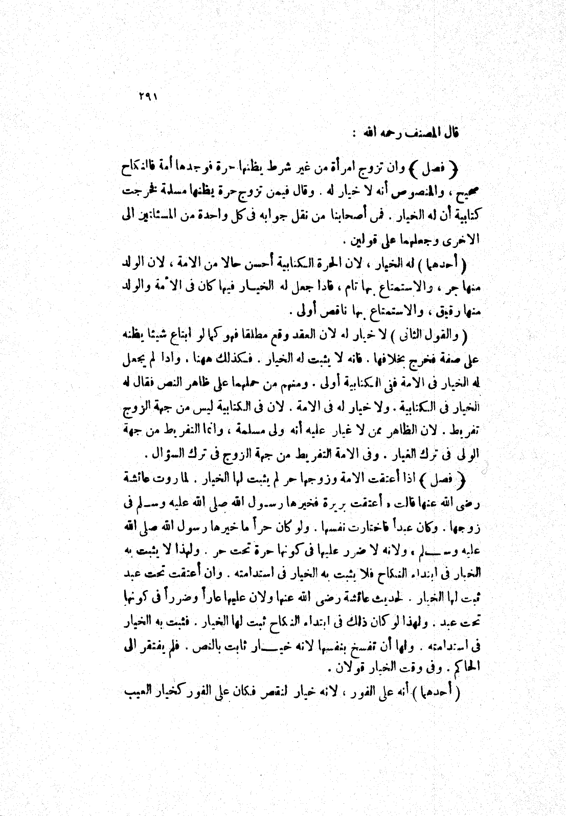 إذا أعتقت الامة وزوجها حر لم يثبت لها الخيار، لِمَا رَوَتْ عَائِشَةُ رَضِيَ اللَّهُ عَنْهَا قَالَتْ (أعتقت بريرة فخيرها رَسُولِ اللَّهِ صَلَّى اللَّهُ عَلَيْهِ وَسَلَّمَ فِي زوجها.