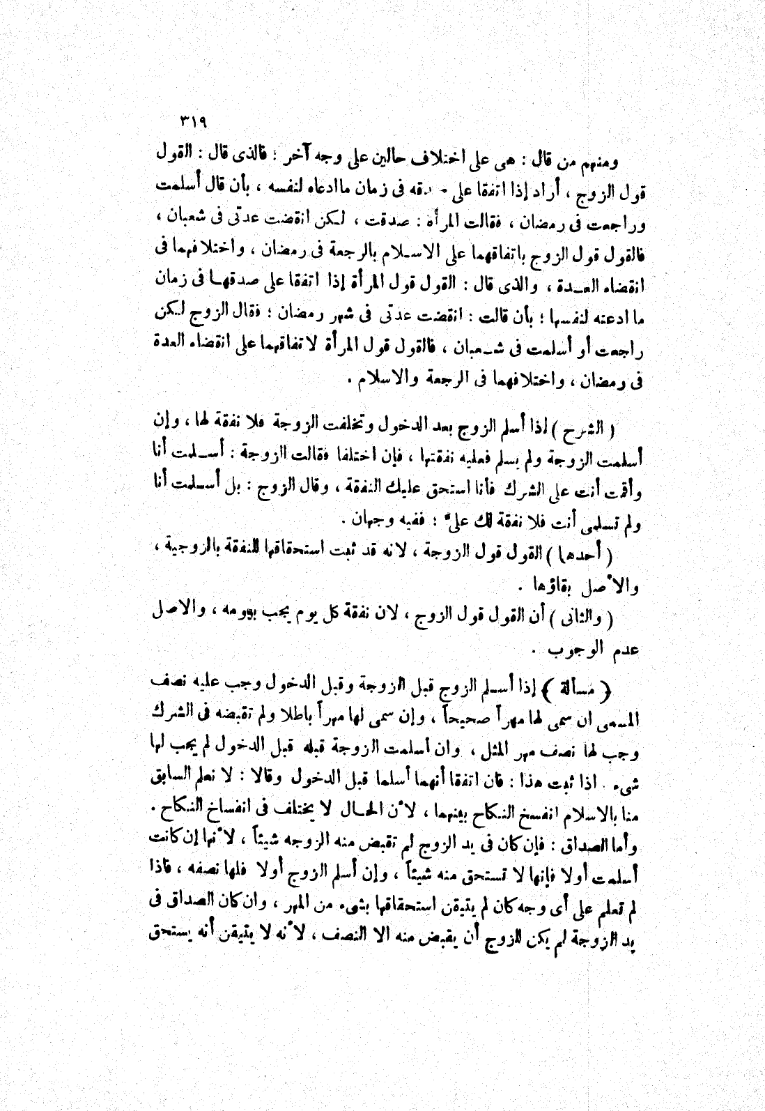 (مسألة) إذا أسلم الزوج قبل الزوجة وقبل الدخول وجب عليه نصف المسمى ان سمى لها مهرا صحيحا، وإن سمى لها مهرا باطلا ولم تقبضه في لشرك وجب لها نصف مهر المثل، وان أسلمت الزوجة قبله قبل الدخول لم يجب لها شئ.