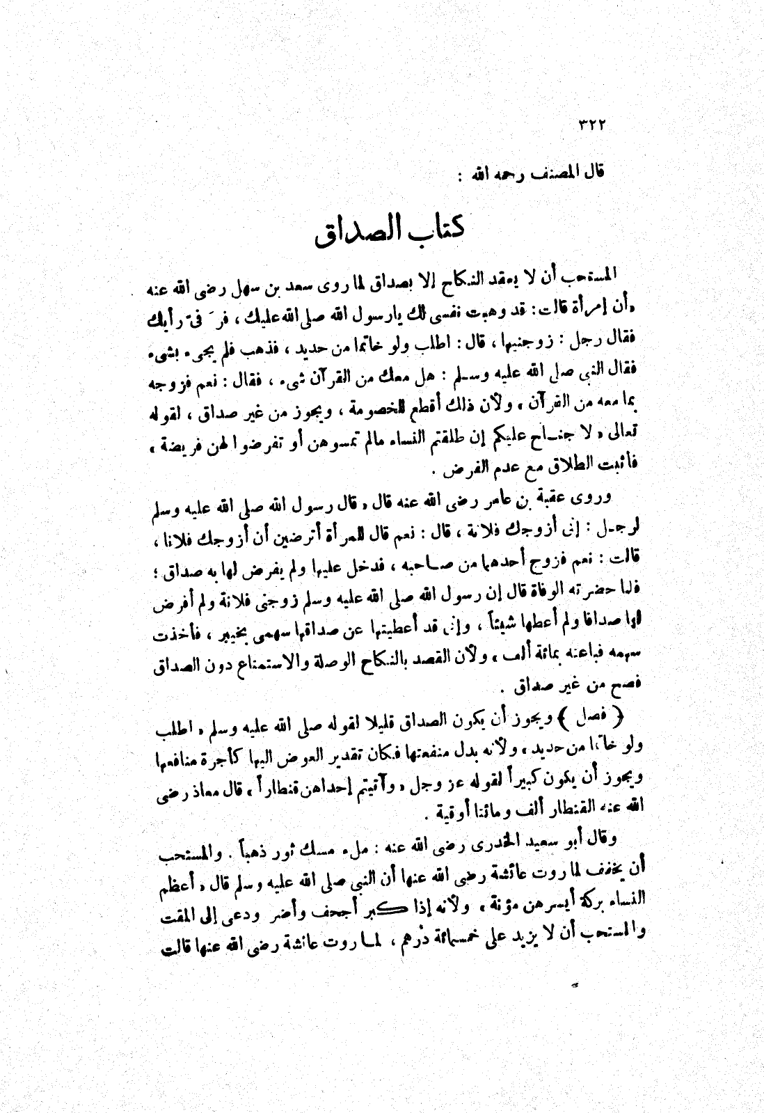 قال المصنف رحمه الله: كتاب الصداق المستحب أن لا يعقد النكاح إلا بصداق لما روى سعد بن سهل رضى الله عنه (أن إمرأة قالت: قد وهبت نفسي لك يا رسول الله صلى الله عليك، فر في رأيك فقال رجل: زوجنيها، قال: اطلب ولو خاتما من حديد، فذهب فلم يجئ بشئ فَقَالَ النَّبِيُّ صَلَّى اللَّهُ عَلَيْهِ وَسَلَّمَ: هَلْ معك من القرآن شئ، فقال: نعم فزوجه بما معه من القرآن) ولان ذلك أقطع الخصومة، ويجوز من غير صداق، لقوله تَعَالَى (لا جُنَاحَ عَلَيْكُمْ إِنْ طَلَّقْتُمُ النِّسَاءَ ما لم تمسوهن أو تفرضوا لهن فريضة) فأثبت الطلاق مع عدم الفرض.