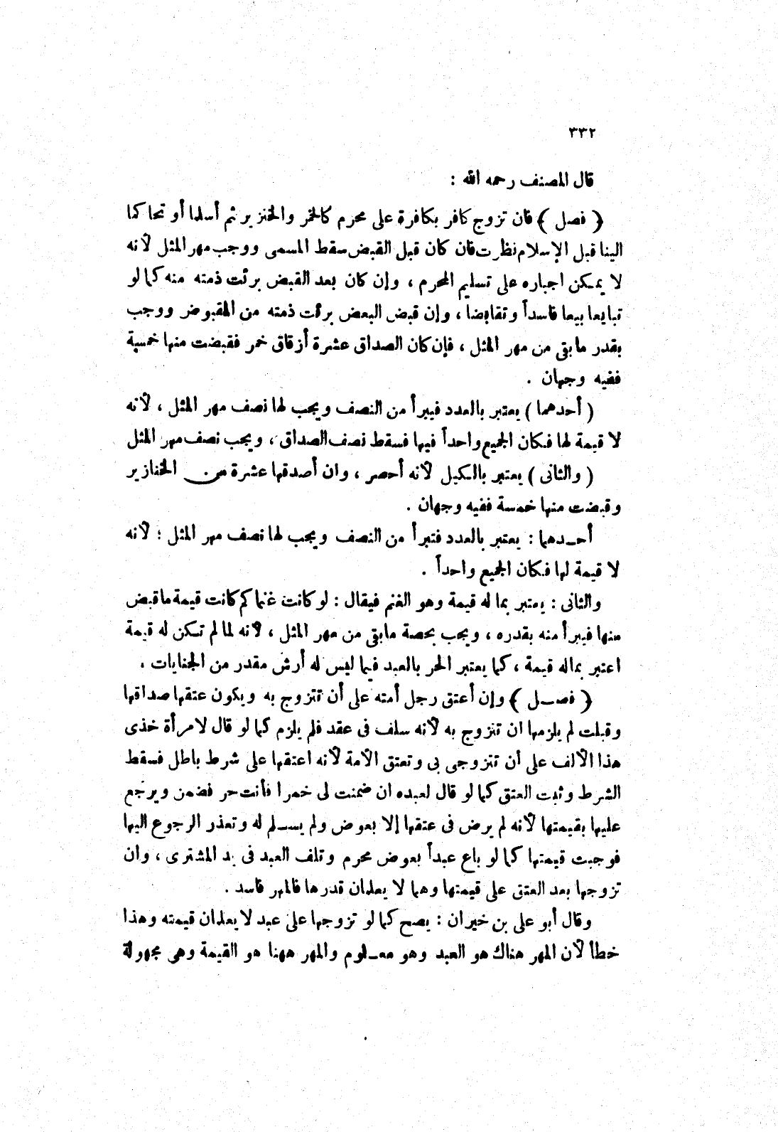 فان تزوج كافر بكافرة على محرم كالخمر والخنزير ثم أسلما أو تحاكما الينا قبل الاسلام نظرت فان كان قبل القبض سقط المسمى ووجب مهر المثل لانه لا يمكن اجباره على تسليم المحرم، وإن كان بعد القبض برئت ذمته منه كما لو تبايعا بيعا فاسدا وتقابضا، وإن قبض البعض برئت ذمته من المقبوض ووجب بقدر ما بقى من مهر المثل، فإن كان الصداق عشرة أزقاق خمر فقبضت منها خمسة ففيه وجهان.