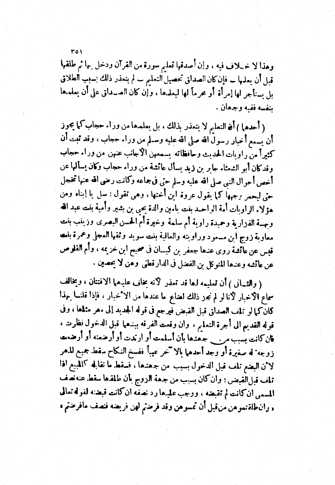 أن التعليم لا يتعذر بذلك، بل يعلمها من وراء حجاب كما يجوز أن يسمع أخبار رَسُولُ اللَّهِ صَلَّى اللَّهُ عَلَيْهِ وَسَلَّمَ مَنْ وراء حجاب، وقد ثبت أن كثيرا من راويات الحديث وحافظاته يسمعهن الاجانب عنهن من وراء حجاب وقد كان أبو الشعثاء جابر بن زيد يسأل عائشة من وراء حجاب وكان يسألها عن أخص أحوال النبي صلى الله عليه وسلم حتى في جماعه وكانت رضى الله عنها تخجل حتى ليحمر وجهها كما يقول عروة ابن أختها، وهى تقول: سل يا إبناه ومن هؤلاء الراويات أمة الواحد بنت يامين والدة يحيى بن بشير وأمية بنت عبد الله وبهسة الفزارية وحميدة راوية أم سلمة وخيرة أم الحسن البصري وزينب بنت معاوية زوج ابن مسعود وراويته والعالية بنت سويد وثقها العجلى وعمرة بنت قيس عن عائشة روى عنها جعفر بن كيسان في صحيح ابن خزيمه، وأم القلوص عن عائشة وعنها المتوكل بن الفضل في الدارقطني وهن لا يحصين.