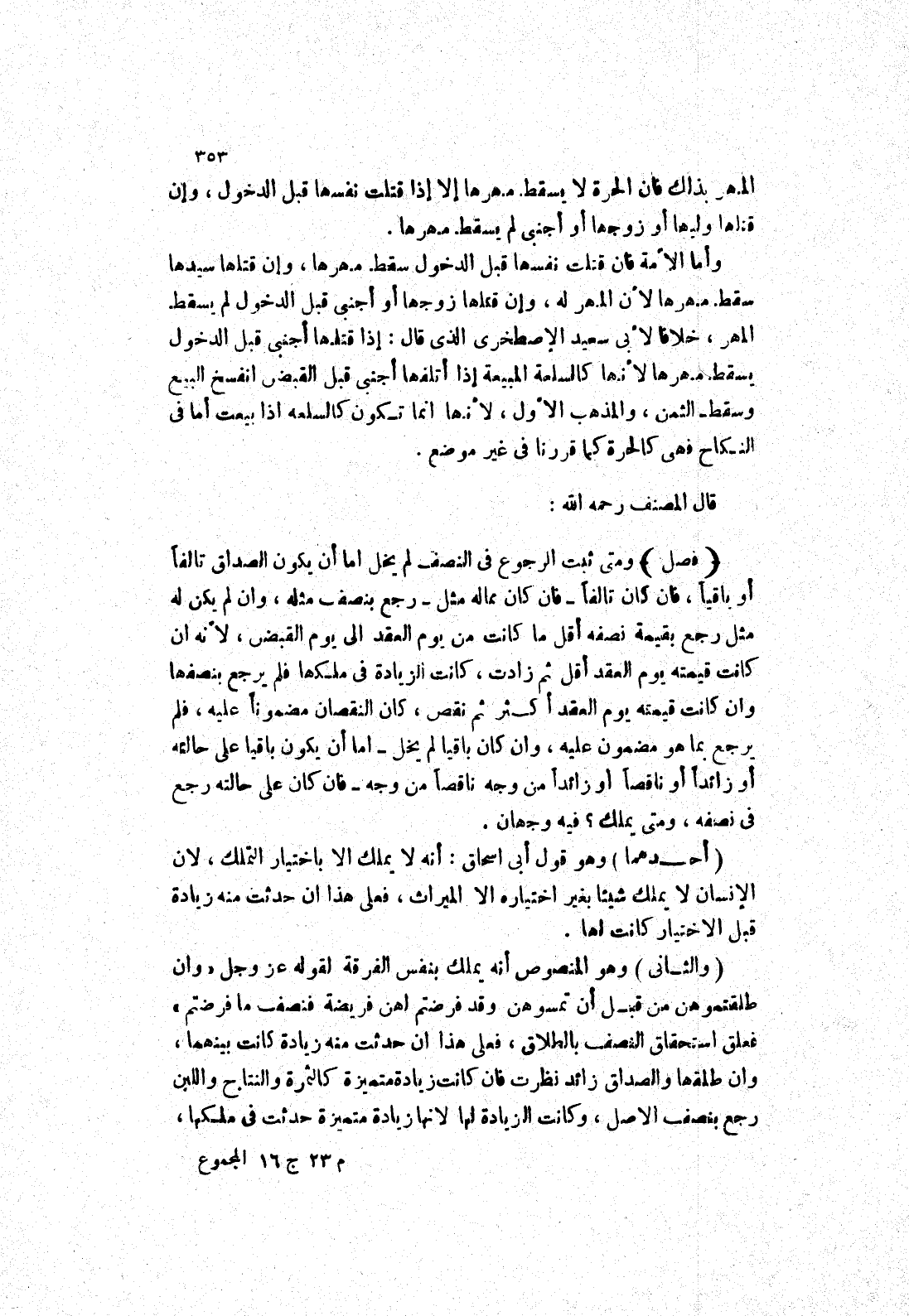 وأما الامة فان قتلت نفسها قبل الدخول سقط مهرها، وإن قتلها سيدها سقط مهرها لان المهر له، وإن قتلها زوجها أو أجنبي قبل الدخول لم يسقط المهر، خلافا لابي سعيد الاصطخرى الذى قال: إذا قتلها أجنبي قبل الدخول يسقط مهرها لانها كالسلعة المبيعة إذا أتلفها أجنبي قبل القبض انفسخ البيع وسقط الثمن، والمذهب الاول، لانها انما تكون كالسلعة إذا بيعت أما في النكاح فهى كالحرة كما قررنا في غير موضع.