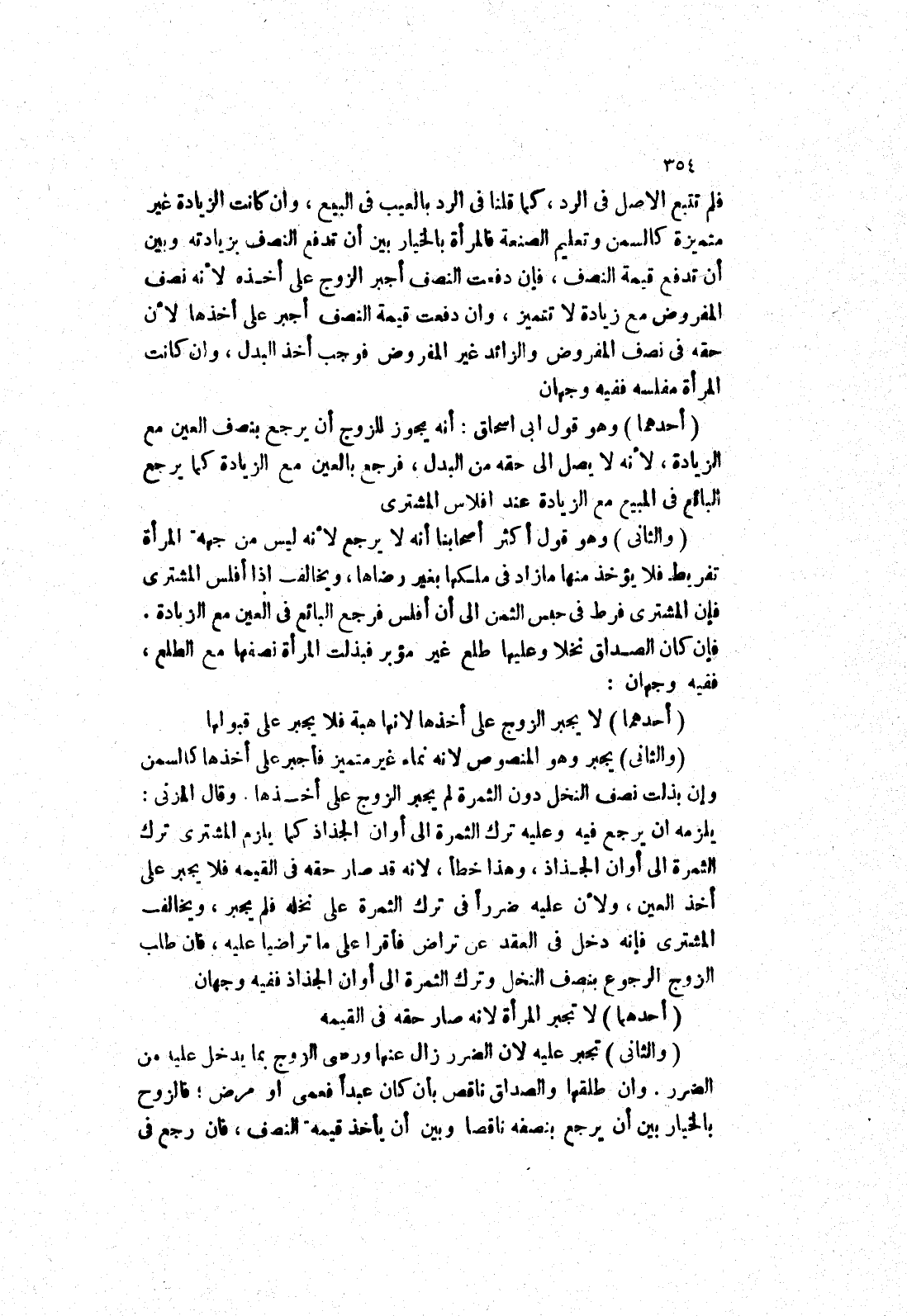 وقال المزني: يلزمه ان يرجع فيه وعليه ترك الثمرة إلى أوان الجذاذ كما يلزم المشترى ترك الثمرة إلى أوان الجذاذ، وهذا خطأ، لانه قد صار حقه في القيمة فلا يجبر على أخذ العين، ولان عليه ضررا في ترك الثمرة على نخله فلم يجبر، ويخالف المشترى فإنه دخل في العقد عن تراض فأقرا على ما تراضيا عليه، فان طلب الزوج الرجوع بنصف النخل وترك الثمرة إلى أوان الجذاذ ففيه وجهان.