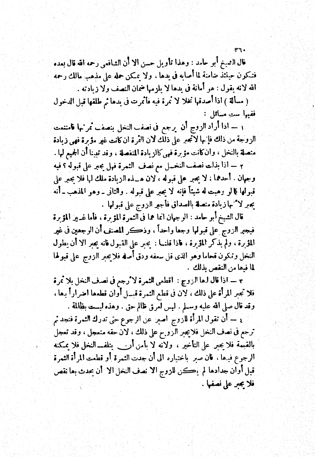 (مسألة) إذا أصدقها نخلا لا ثمرة فيه فأثمرت في يدها ثم طلقها قبل الدخول ففيها ست مسائل: 1 إذا أراد الزوج أن يرجع في نصف النخل بنصف ثمرتها فامتنعت
