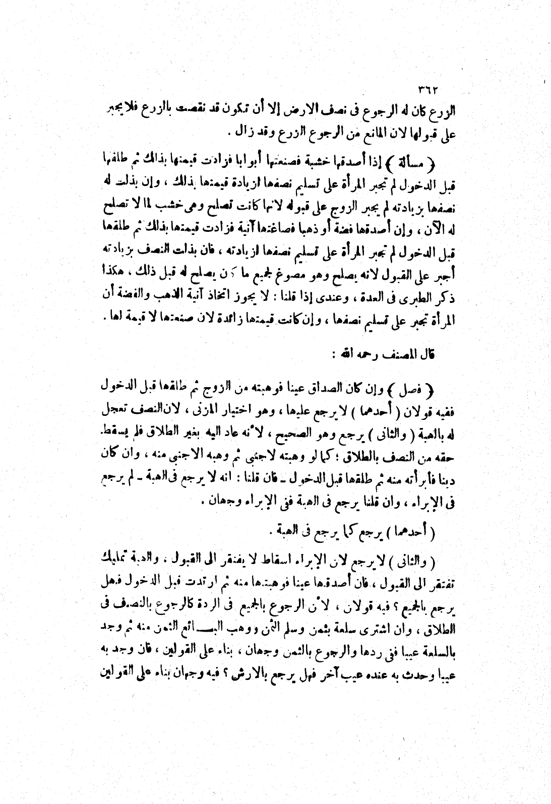 (مسألة) إذا أصدقها خشبة فصنعتها أبوابا فزادت قيمتها بذلك ثم طلقها قبل الدخول لم تجبر المرأة على تسليم نصفها لزيادة قيمتها بذلك، وإن بذلت له نصفها بزيادته لم يجبر الزوج على قبوله لانها كانت تصلح وهى خشب لما لا تصلح له الآن، وإن أصدقها فضة أو ذهبا فصاغتها آنية فزادت قيمتها بذلك ثم طلقها قبل الدخول لم تجبر المرأة على تسليم نصفها لزيادته، فان بذلت النصف بزيادته أجبر على القبول لانه يصلح وهو مصوغ لجميع ما كان يصلح له قبل ذلك، هكذا ذكر الطبري في العدة، وعندي إذا قلنا: لا يجوز اتخاذ آنية الذهب والفضة أن المرأة تجبر على تسليم نصفها، وإن كانت قيمتها زائدة لان صنعتها لا قيمة لها.