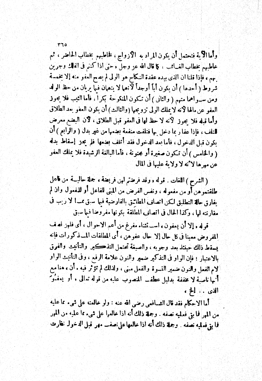 أن تكون المنكوحة بكرا، فأما الثيب فلا يجوز العفو عن مالها لانه لا يملك الولى تزويجها (والثالث) أن يكون العفو بعد الطلاق وأما قبله فلا يجوز لانه لا حظ لها في العفو قبل الطلاق، لان البضع معرض للتلف، فإذا عفا ربما دخل بها فتلفت منفعة بضعها من غير بدل (والرابع) أن يكون قبل الدخول، فأما بعد الدخول فقد أتلف بضعها فلم يجز إسقاط بدله (والخامس) أن تكون صغيرة أو مجنونة، فأما البالغة الرشيدة فلا يملك العفو