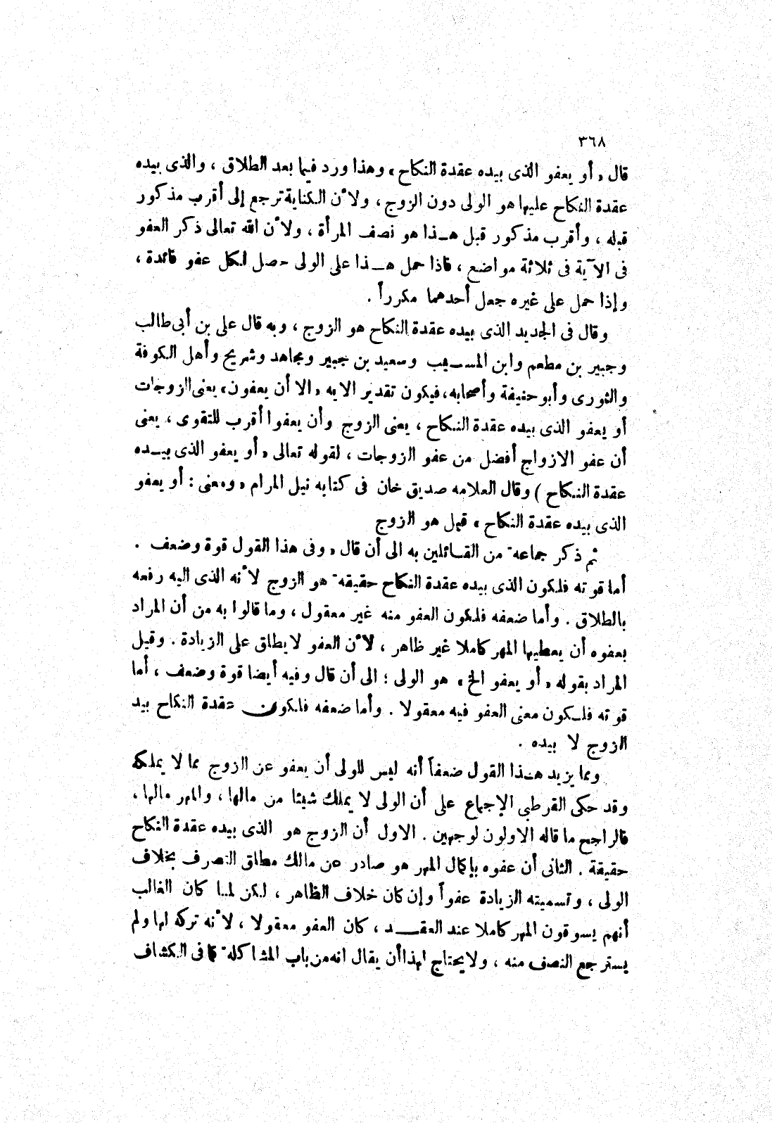 ومما يزيد هذا القول ضعفا أنه ليس للولى أن يعفو عن الزوج مما لا يملكه وقد حكى القرطبى الاجماع على أن الولى لا يملك شيئا من مالها، والمهر مالها، فالراجح ما قاله الاولون لوجهين.