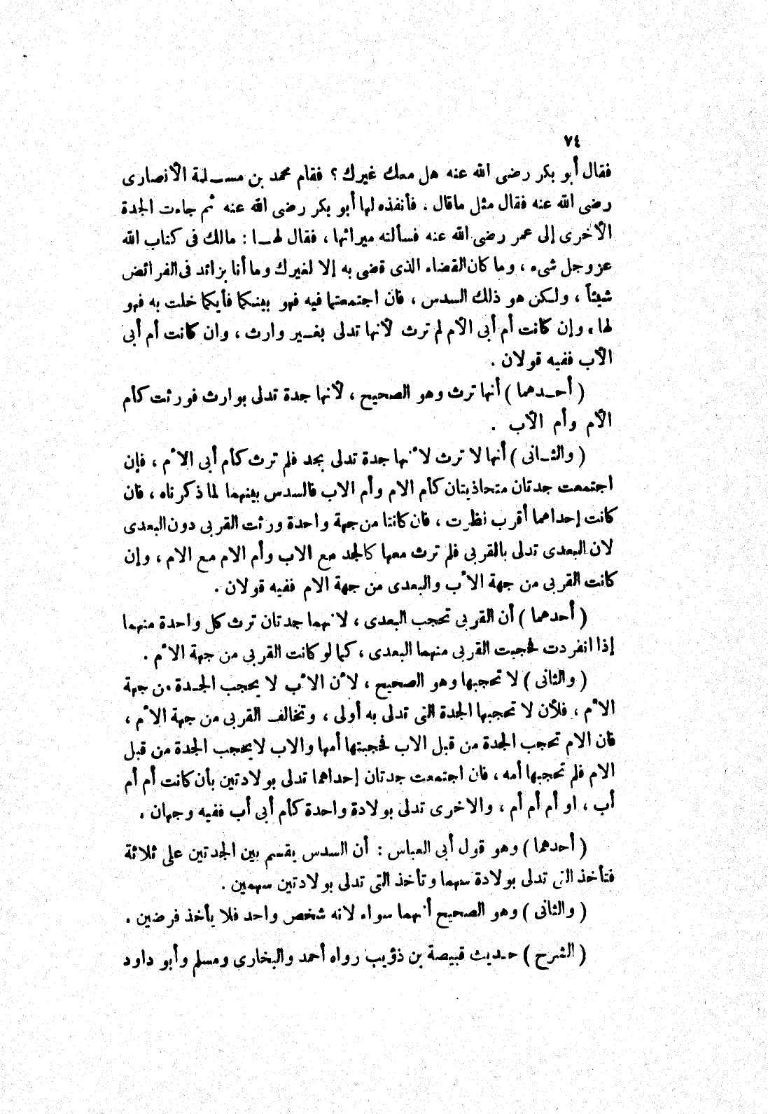 فقال أبو بكر رضى الله عنه هل معك غيرك؟ فقام محمد بن مسلمة الانصاري رضى الله عنه فقال مثل ما قال، فأنفذه لها أبو بكر رضى الله عنه ثم جاءت الجدة الاخرى إلى عمر رضى الله عنه فسألته ميراثها، فقال لها: مالك في كتاب الله عز وجل شئ، وما كان القضاء الذى قضى به إلا لغيرك وما أنا بزائد في الفرائض شيئا، ولكن هو ذلك السدس، فان اجتمعتما فيه فهو بينكما فأيكما خلت به فهو لها) وإن كات أم أبى الام لم ترث لانها تدلى بغير وارث، وان كانت أم أبى الاب ففيه قولان.