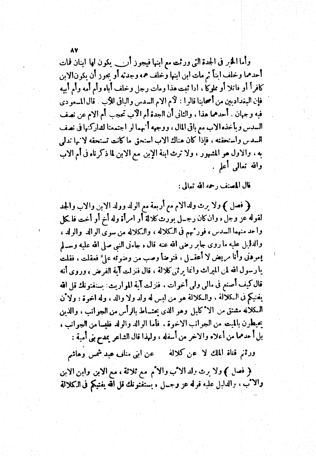 ولا يرث ولد الام مع أربعة مع الولد وولد الابن والاب والجد لقوله عز وجل (وان كان رجل يورث كلالة أو امرأة وله أخ أو أخت فلكل واحد منهما السدس) فورثهم في الكلاله، والكلاله من سوى الوالد والولد، والدليل عليه ما روى جابر رضى الله عنه قال (جاءني النبي صلى الله عليه وسلم يعودني وأنا مريض لا أعقل، فتوضأ وصب من وضوئه على فعقلت، فقلت يا رسول الله لمن الميراث وانما يرثنى كلالة، قال فنزلت آية الفرض) وروى أنه قال كيف أصنع في مالى ولى أخوات، فنزلت آية المواريث: يستفتونك قل الله يفتيكم في الكلالة، والكلالة هو من ليس له ولد ولا والد، وله اخوة، ولان الكلاله مشتق من الاكليل وهو الذى يحتاط بالرأس من الجوانب، والذين يحيطون بالميت من الجوانب الاخوة، فأما الوالد والولد فليسا من الجوانب، بل أحدهما من أعلاه والاخر من أسفله، ولهذا قال الشاعر يمدح بنى أمية: ورثتم قناة الملك لا عن كلالة