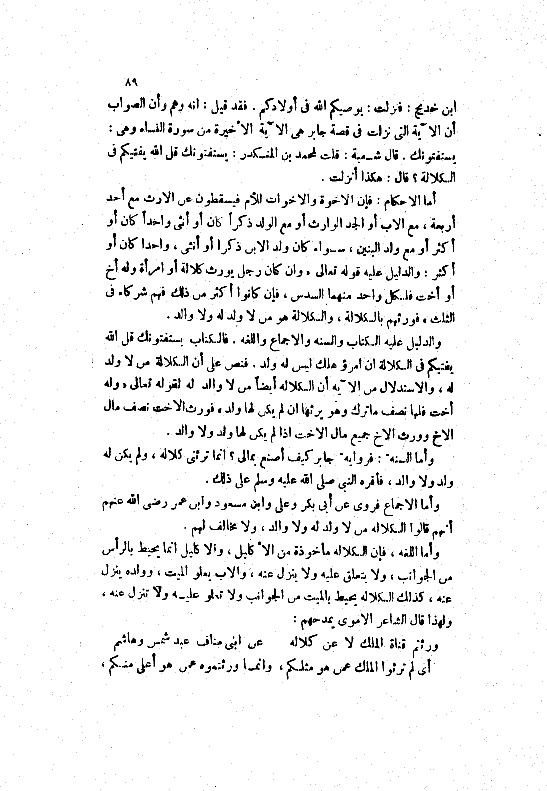 وأما اللغه، فإن الكلاله مأخوذة من الاكليل، والاكليل انما يحيط بالرأس من الجوانب، ولا يتعلق عليه ولا ينزل عنه، والاب يعلو الميت، وولده ينزل عنه، كذلك الكلاله له يحيط بالميت من الجوانب ولا تعلو عليه ولا تنزل عنه، ولهذا قال الشاعر الاموى يمدحهم: ورثتم قناة الملك لا عن كلاله