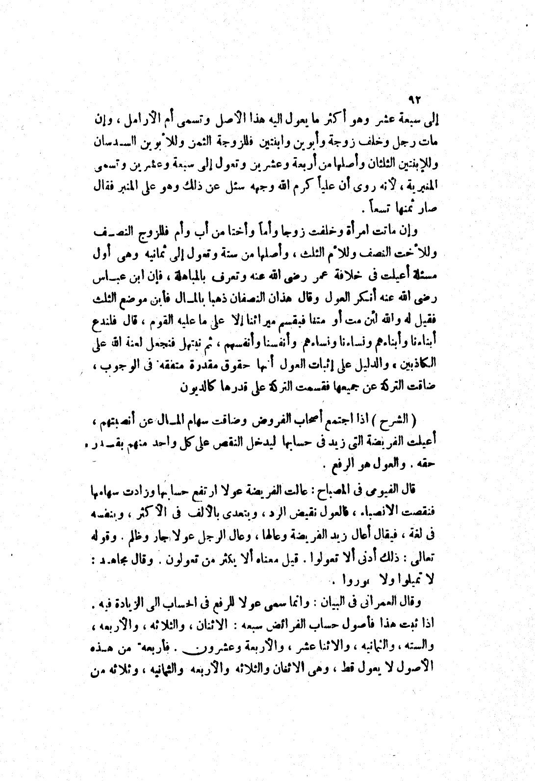 وإن ماتت امرأة وخلفت زوجا وأما وأختا من أب وأم فللزوج النصف وللاخت النصف وللام الثلث، وأصلها من ستة وتعول إلى ثمانيه وهى أول مسألة أعيلت في خلافة عمر رضى الله عنه وتعرف بالمباهلة، فإن ابن عباس رضى الله عنه أنكر العول وقال هذان النصفان ذهبا بالمال فأبن موضع الثلث فقيل له والله لئن مت أو متنا فيقسم ميراثنا إلا على ما عليه القوم، قال فلندع أبناءنا وأبناءهم ونساءنا ونساءهم وأنفسنا وأنفسهم، ثم نبتهل فنجعل لعنة الله على الكاذبين) والدليل على إثبات العول أنها حقوق مقدرة متفقة في الوجوب،