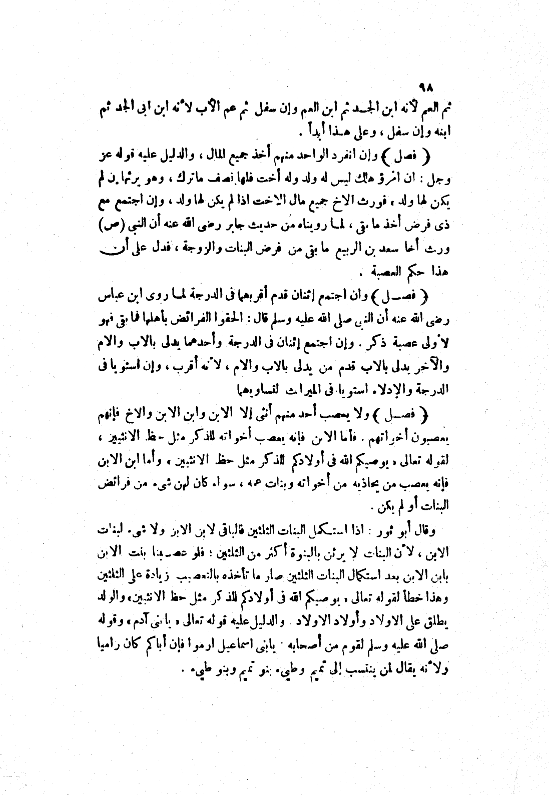 فأما الابن فإنه يعصب اخواته للذكر مثل حظ الانثيين، لقوله تعالى (يوصيكم الله في أولادكم للذكر مثل حظ الانثيين) وأما ابن الابن فإنه يعصب من يحاذيه من أخواته وبنات عمه، سواء كان لهن شئ من فرائض البنات أو لم يكن.